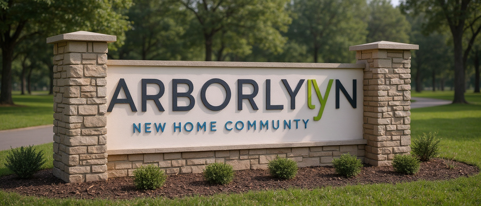 make an entrance sign for a new home community called arborlynn use this logo as an inspiration use a stacked stone base craftsman style