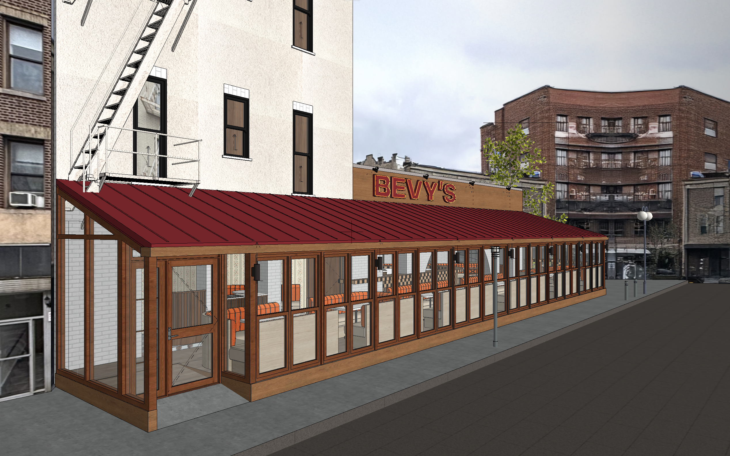 photorealistic golden hour exterior of the bevy s caf in new york with warm low angle sunlight hitting the deep burgundy roof and dark oak veneer window frames glowing reflections on the glass the dark oak parapet and upper fa ade panel holding the burgundy bevy s sign outlined with bright orange neon tubing soft interior lighting mixing with sunset tones black fa ade spotlights creating gentle highlights long warm shadows on the pavement and a cinematic new york backdrop with brick buildings and soft amber sky