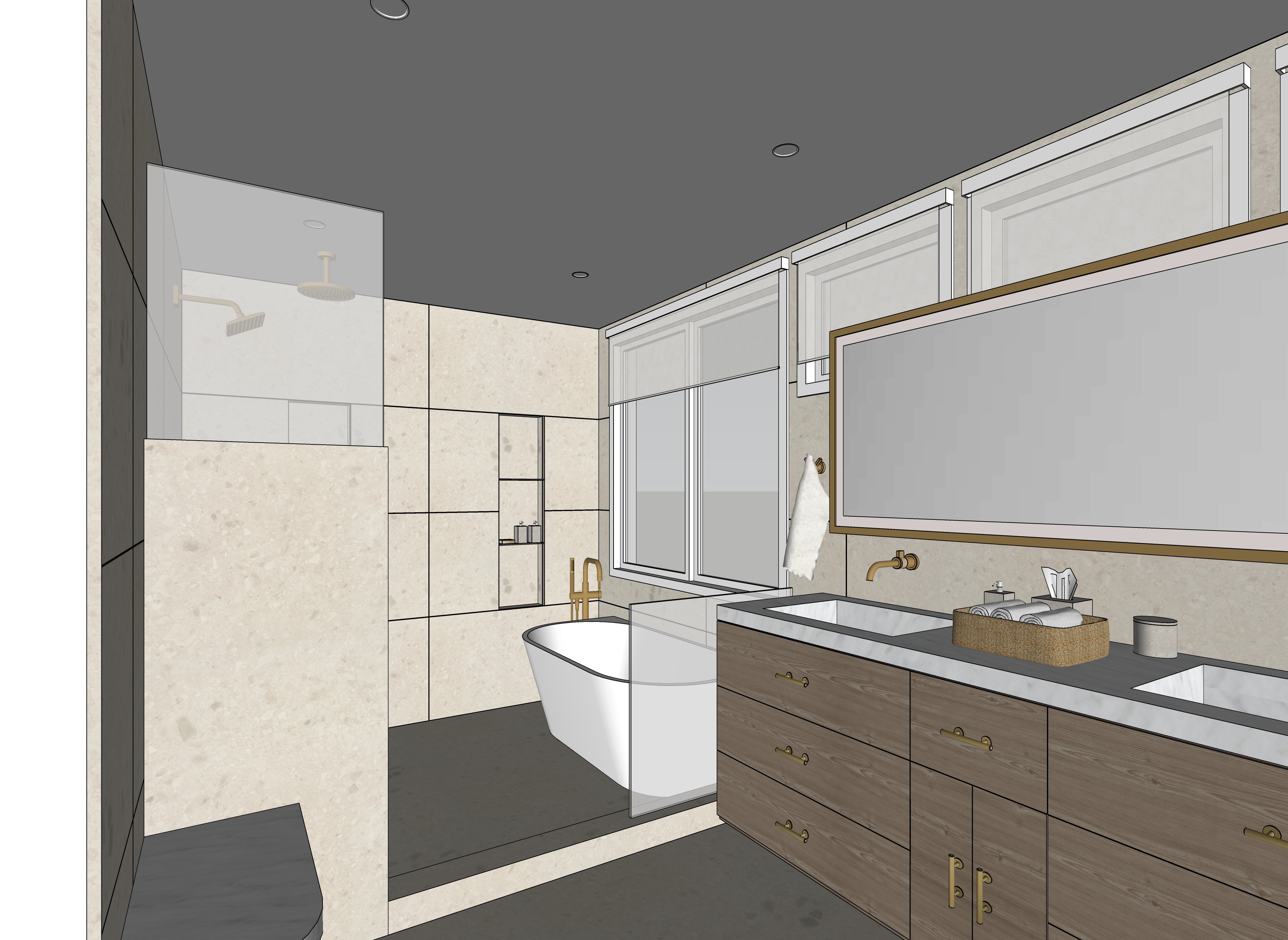make the lighting evening time add led light on the niches shower and the tub add led lighting around the bathroom mirror add bathroom accessories and towels to the view add light coming from the recessed lights on the ceiling the walls and floor are an ivory colored porcelain tile with a matte finish where the source image shows this material the other walls and ceiling are painted white the ceiling with painted white no led lights at the bench in the shower keep the window shades in the source image