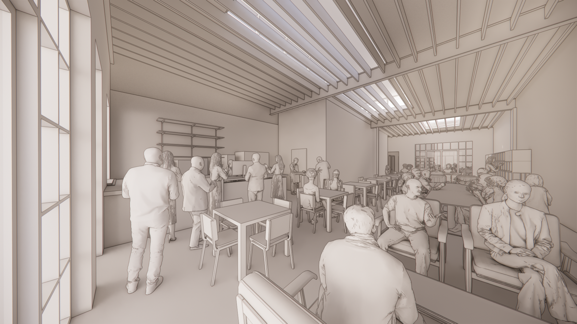 a bustling modern cafe interior filled with people wooden beams soft ambient lighting filters through large windows walls painted in warm beige tones flooring in light concrete tables and chairs are wooden and minimalist in design featuring a mix of white and light grey window frames to be dark wood people are casually dressed in light pastel colors enhancing a relaxed and welcoming atmosphere shelving and countertops in muted grey tones rendered at nighttime with a harmonious and tranquil color palette