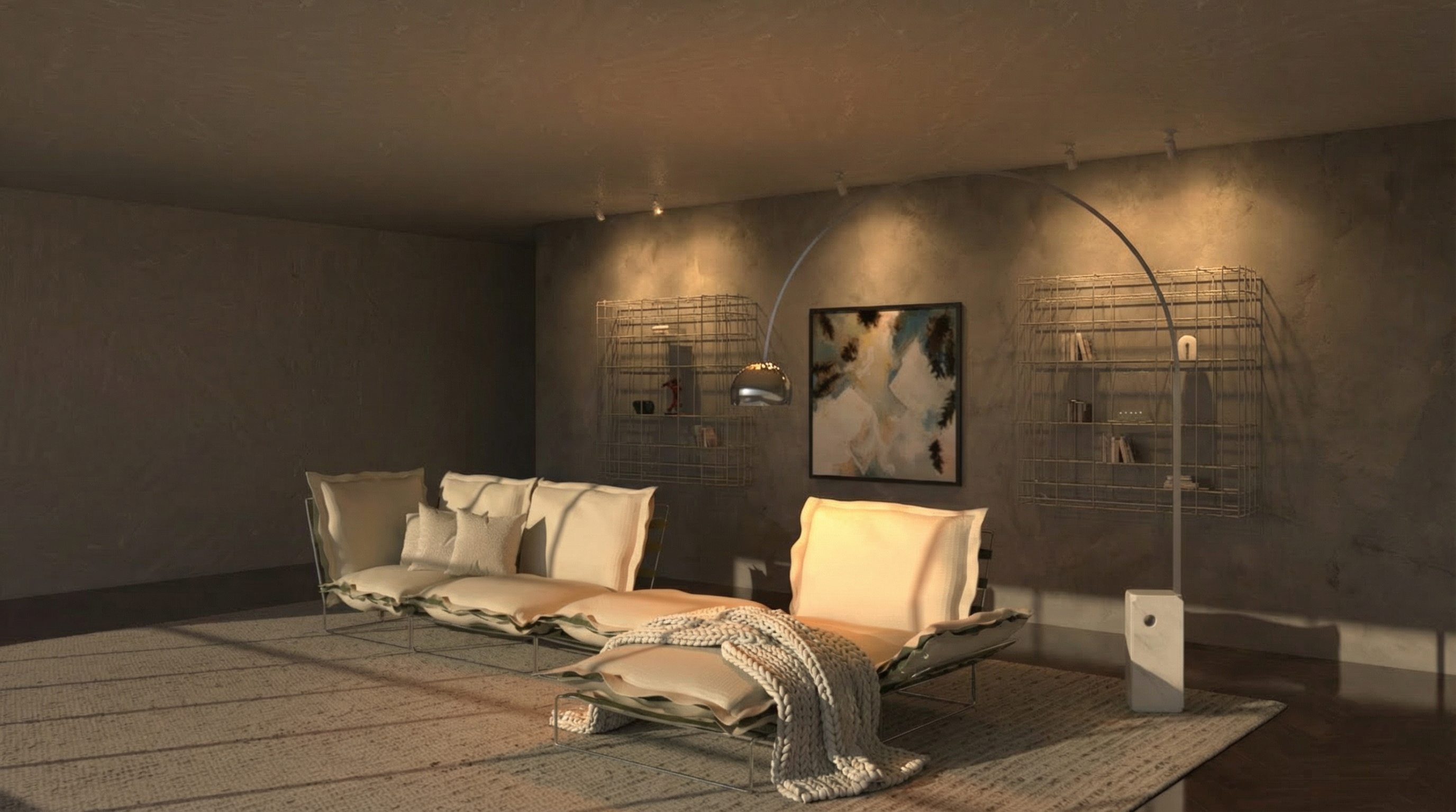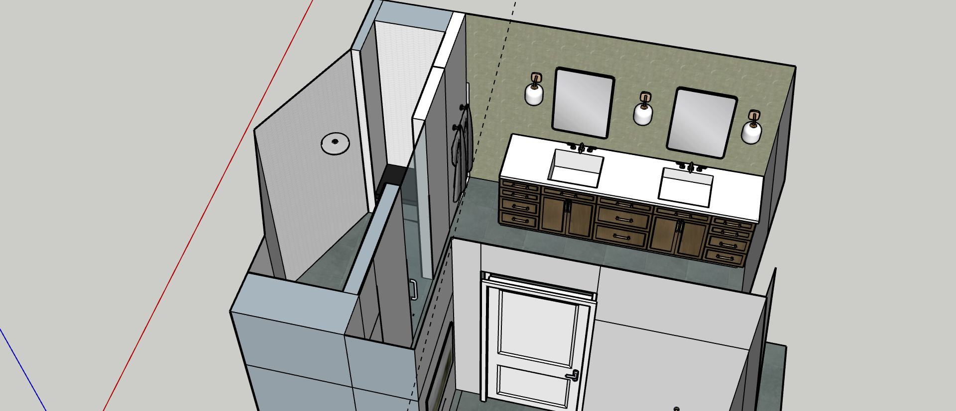 show a realistic view of this bathroom view is looking down onto the floor plan no windows bright lighting no robe hooks in the toilet room interior shower walls to be tile the black areas are bench seats rain can shower head include body sprays on angled walls add robes on hooks by the vanity as shown