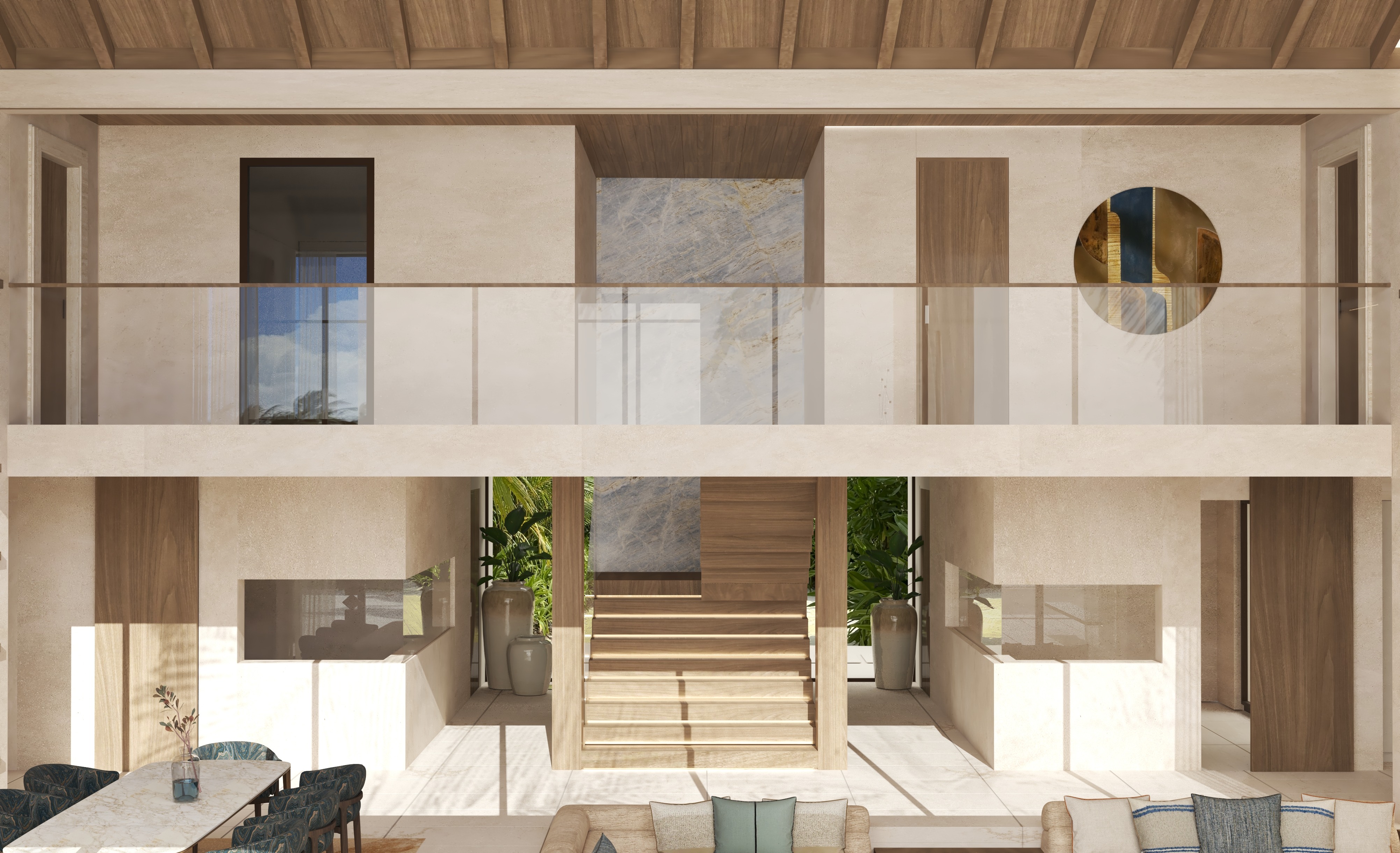 enhance this render into a soft photorealistic coastal scene while preserving all architectural details materials furniture placement camera angle and composition exactly as shown do not change the design layout landscaping or colors reduce the contrast slightly and create an airy summery mood gentle shadows warm highlights enhance realism textures reflections wood stone glass and water while keeping the original palette light warm and neutral