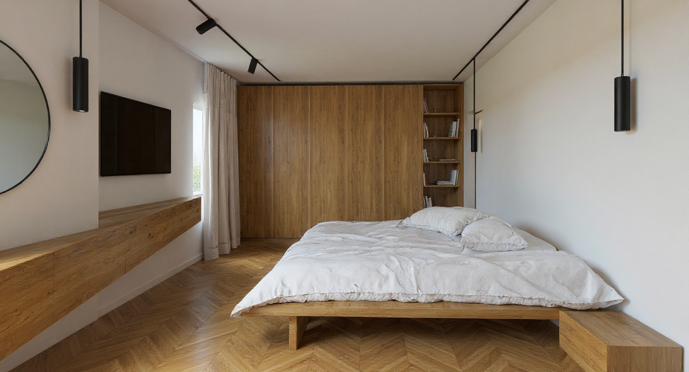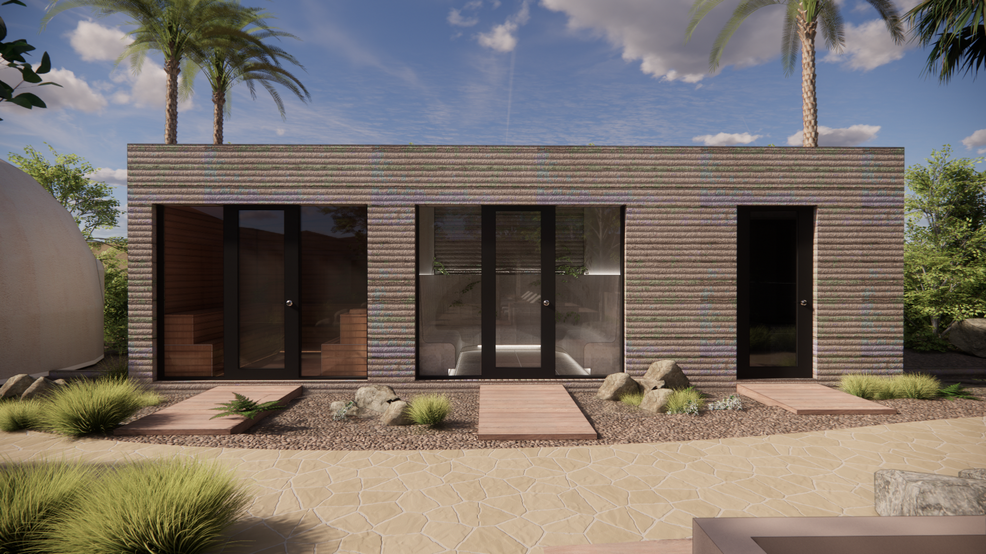 render a high end wellness space with board form concrete building and a water pond infront that makes the buildings appear as floating on water the wood decks bring you into the building architecture
