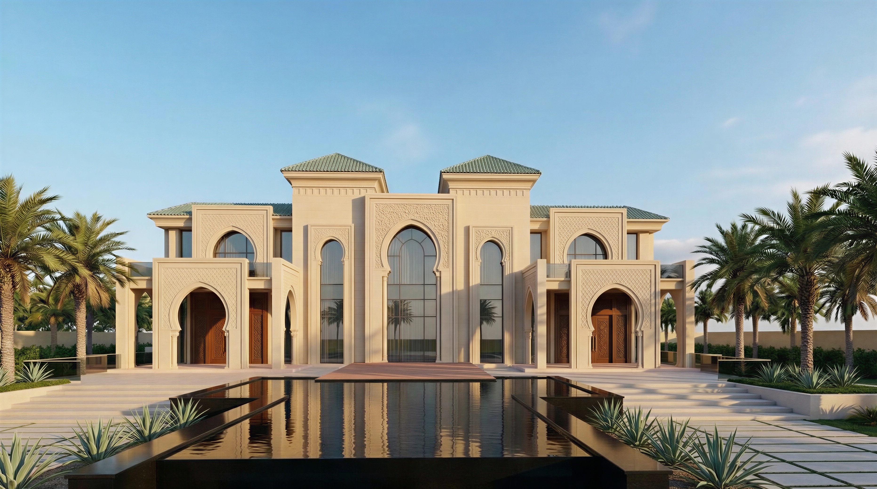 exterior shot moroccan style luxury villa traditional arches zellige tiles tadelakt walls carved plaster details central courtyard with fountain palm trees warm earthy colors natural materials golden sunlight cinematic lighting ultra realistic architectural render 8k dont change in the mass