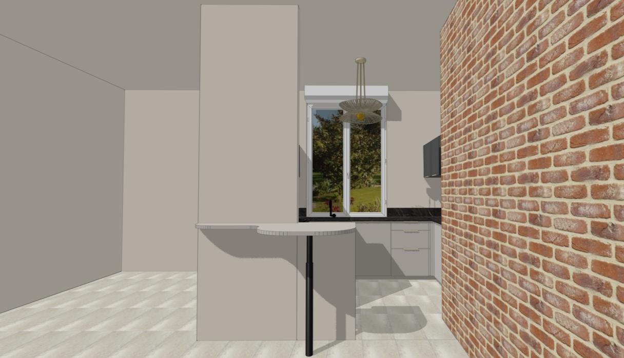 ajoute de la d coration et de la vaisselle sur le plan de travail et l ilot ajoute un tableau sur le mur au dessus de l ilot et un tabouret devant l ilot conserve les couleurs et mat riaux de l image