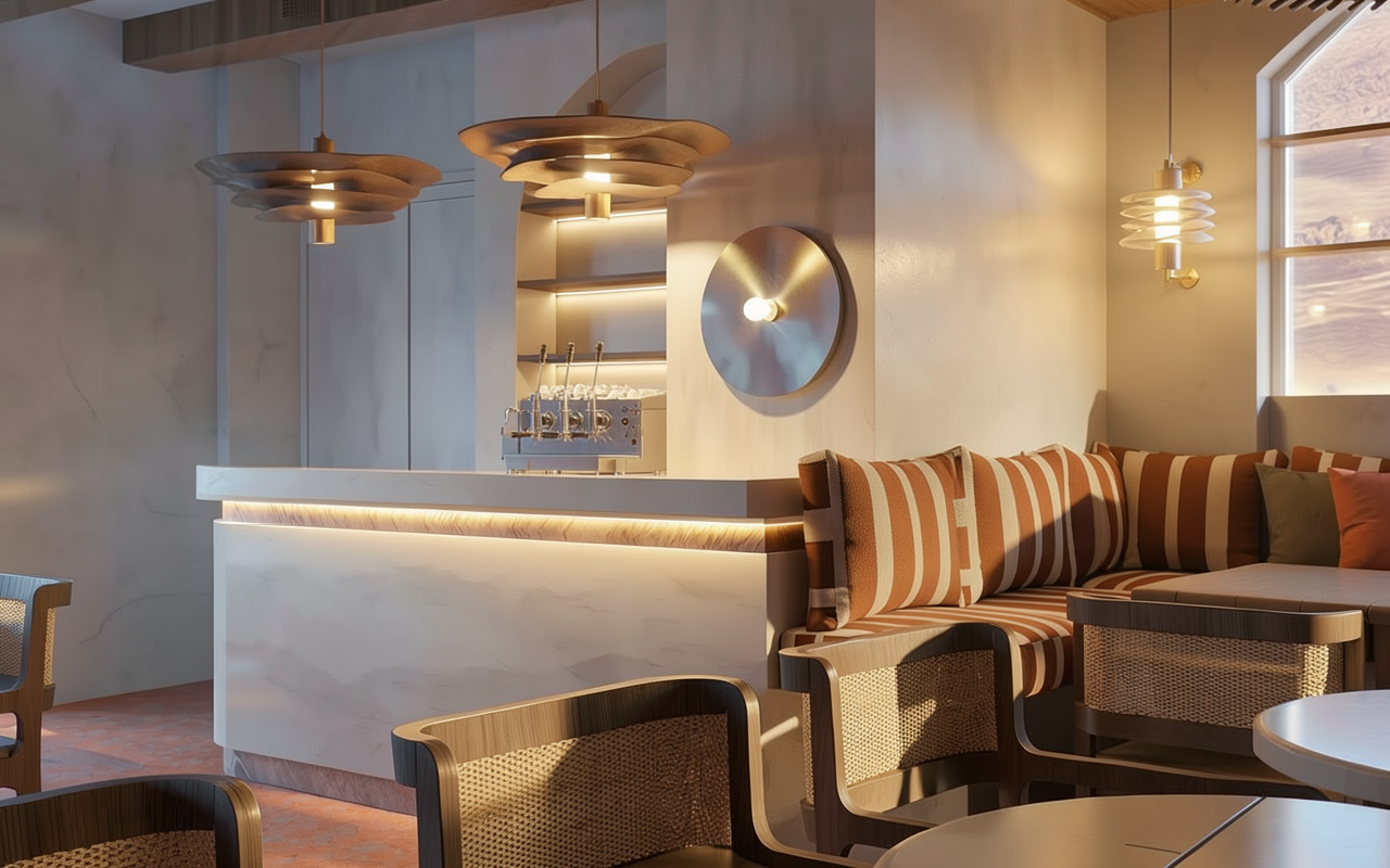 lighting very important create a moody spa lighting environment add soft recessed ceiling lighting warm temperature 2700k dimmed low gentle ambient glow not bright or flat pendant emits a warm soft glow focal lighting add subtle indirect lighting under bench or behind vanity for a soft floating effect lighting should be layered soft highlights on marble gentle shadows in corners no harsh or even lighting color tone slightly desaturate overall tones for a calm spa like palette add warmth to materials no cool blue lighting atmosphere moody but serene soft shadow gradients calm quiet high end spa feel add subtle steam haze effect in the shower area for atmosphere very light not foggy styling add minimal spa styling rolled white towels on bench or shelf simple vessel or tray with neutral accessories keep clean and uncluttered overall style luxury spa bathroom moody warm and calming high end resort wellness retreat aesthetic