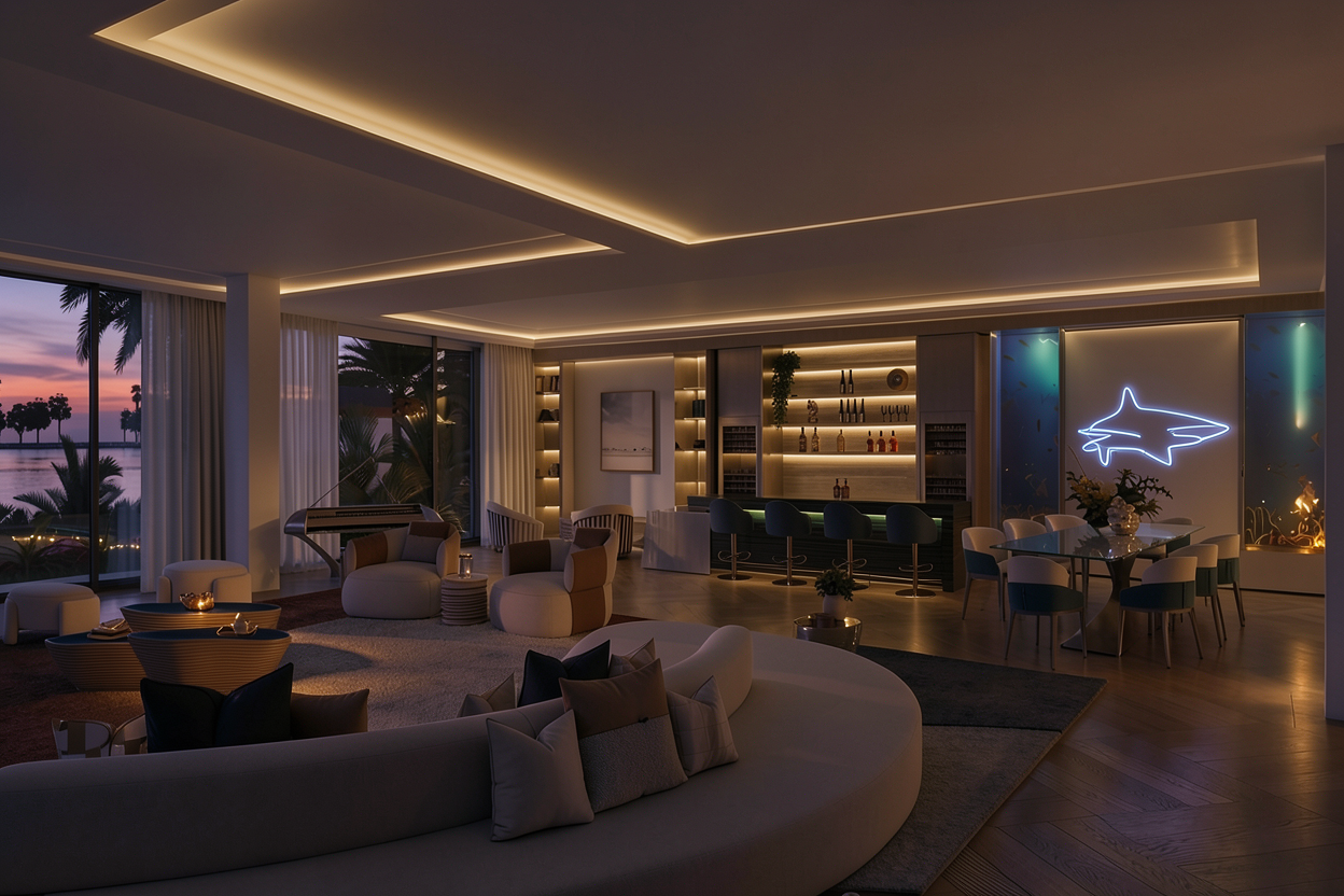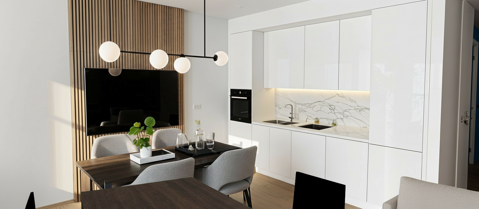 bright day time natural lighting soft shadows space is evenly liddownlights enterior photography realisticslightly reflective led ip lighting bellow the upper cabinet in the kitchen a dark teal herringbone patterned tiles on the backsplash in the kitchen black appliances