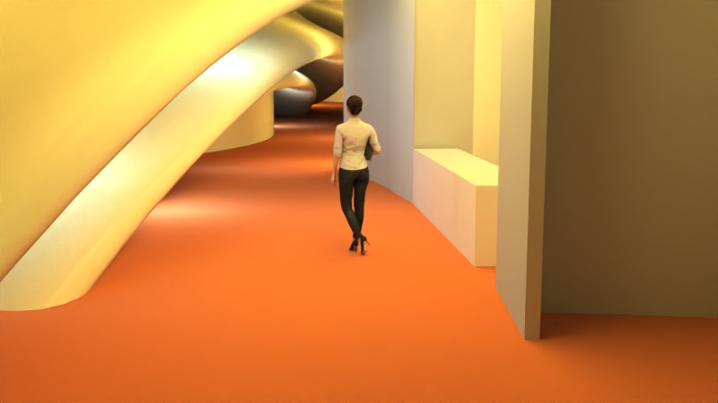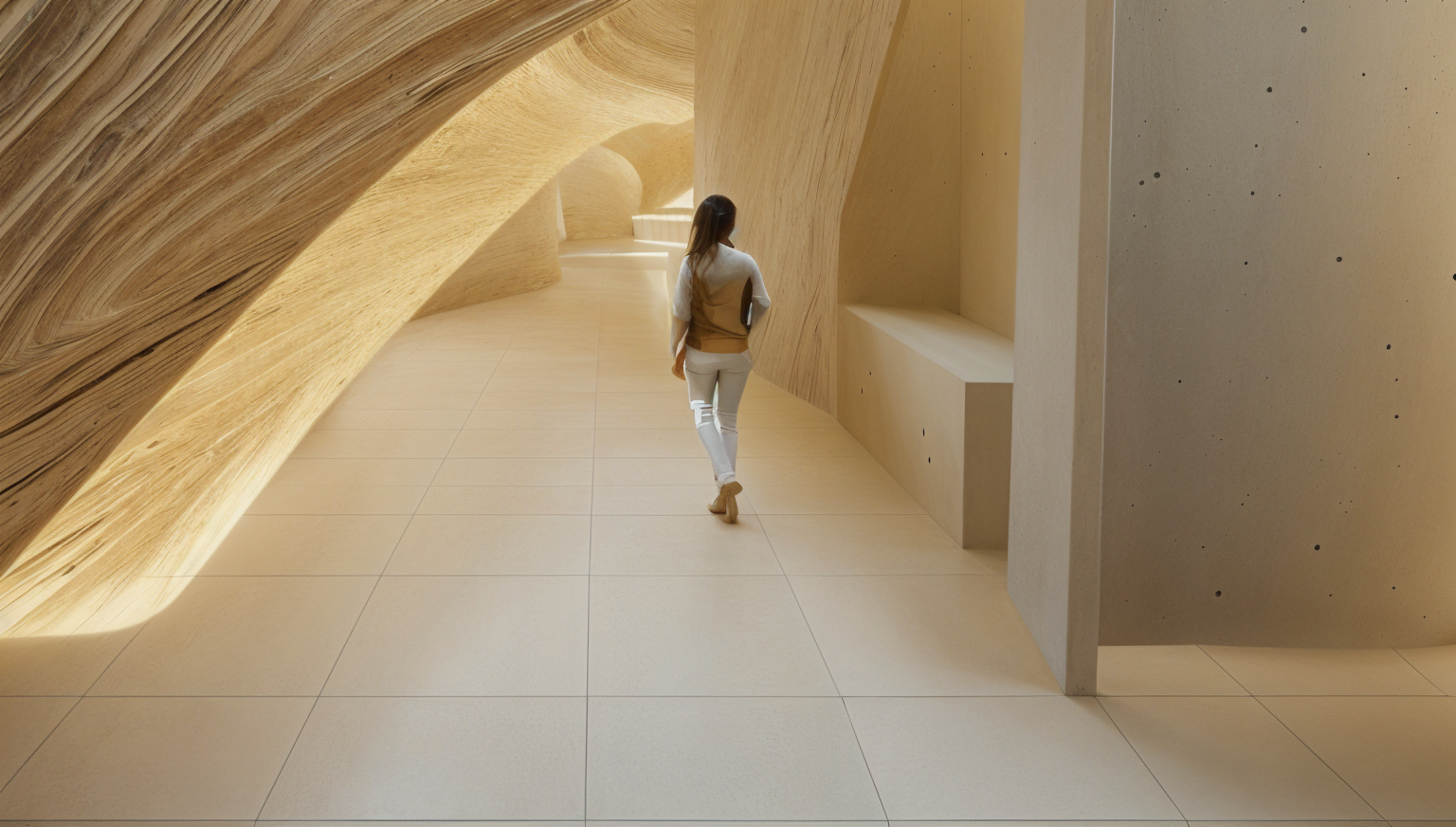 final prompt golden hour rough surfaces natural light the wavy wall on the left should be large windows to the outside tile floor granite on the counter top a monumental hyperrealistic architectural interior featuring vast undulating hand crafted concrete forms with rough organic surfaces resembling carved stone or weathered earth the space is defined by flowing bridges ramps and sculptural voids that create dynamic multi level circulation golden hour sunlight floods the space through massive floor to ceiling glazed facades and irregular skylights above casting long warm beams of light that intensify the rich textures of the rugged walls the natural light bathes the interior in a soft amber glow creating deep elongated shadows that emphasize the tactile materiality of the surfaces at the heart of the open atrium a full mammoth fossil skeleton is dramatically displayed suspended or mounted within the open space its towering ancient form contrasts against the modern cave like architecture bathed in a halo of golden light people of varying scale interact casually with the exhibit adding a lively human atmosphere to the raw monumentalism of the environment the mood is luminous majestic and slightly surreal a seamless fusion of natural history and contemporary architecture key elements surface rugged hand troweled concrete or plaster rough visible imperfections lighting warm saturated golden hour sunlight long shadows glows across textured walls atmosphere majestic airy timeless subtle urban landscape visible outside through windows camera perspective slightly wide angle emphasizing depth vertical scale and flowing circulation paths architecture