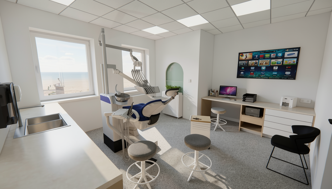 make a render tune the texture to realistic make the wiev to perspective make the view trought the window with a town panoramatic for nitra in slovakia to wiev of zobor change in the dental chair unit the metal round sink to white change on the 3 chairs delete the rings and make on the foots wheels