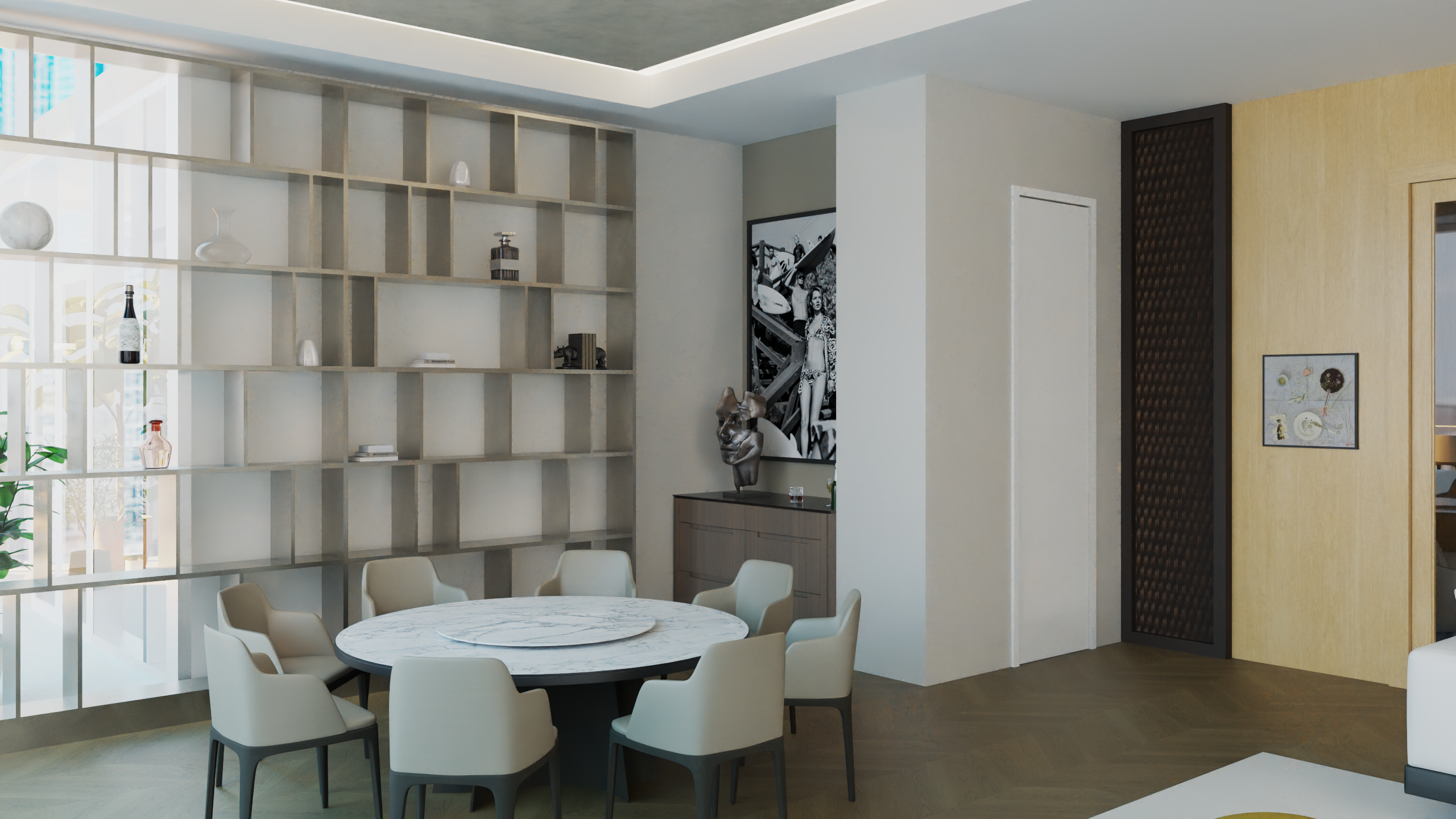 modern dining room minimalist design featuring a round marble table with soft white and gray veining surrounded by elegant off white chairs with dark gray legs the back wall showcases a sophisticated open shelf in light beige metal fatina almost satin nickel with little bit or brown tone adorned with decorative glass vases books and small sculptures to the right a wooden paneled wall in light maple complements the room with a subtle abstract painting framed in black warm natural light filters through large windows casting soft shadows for a serene and inviting atmosphere