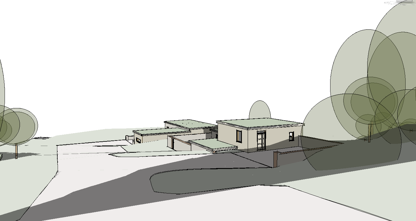 render two modern dwellings made from beige coloured natural stone and light coloured timber with green roofs set in the countryside with trees and foliage surrounding them
