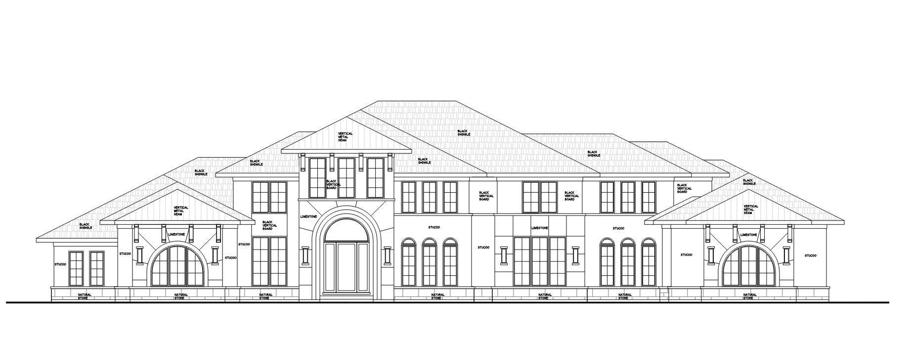 a photorealistic front elevation view of an elegant residential building with large portrait cream clay panels with prominent seams and white stucco natural stone at the bottom with light grey to dark grey undertones black vertical board on the upper portion the roof should be black shingles there are some roofs with vertical metal seams the trim soffit and fascia near the roof to be black black corbels below roof the window frames should be black metal the interior should have soft glowing white lighting the landscape should show large trees in the background daytime with clouds in the sky do not change the view do not change geometry of house
