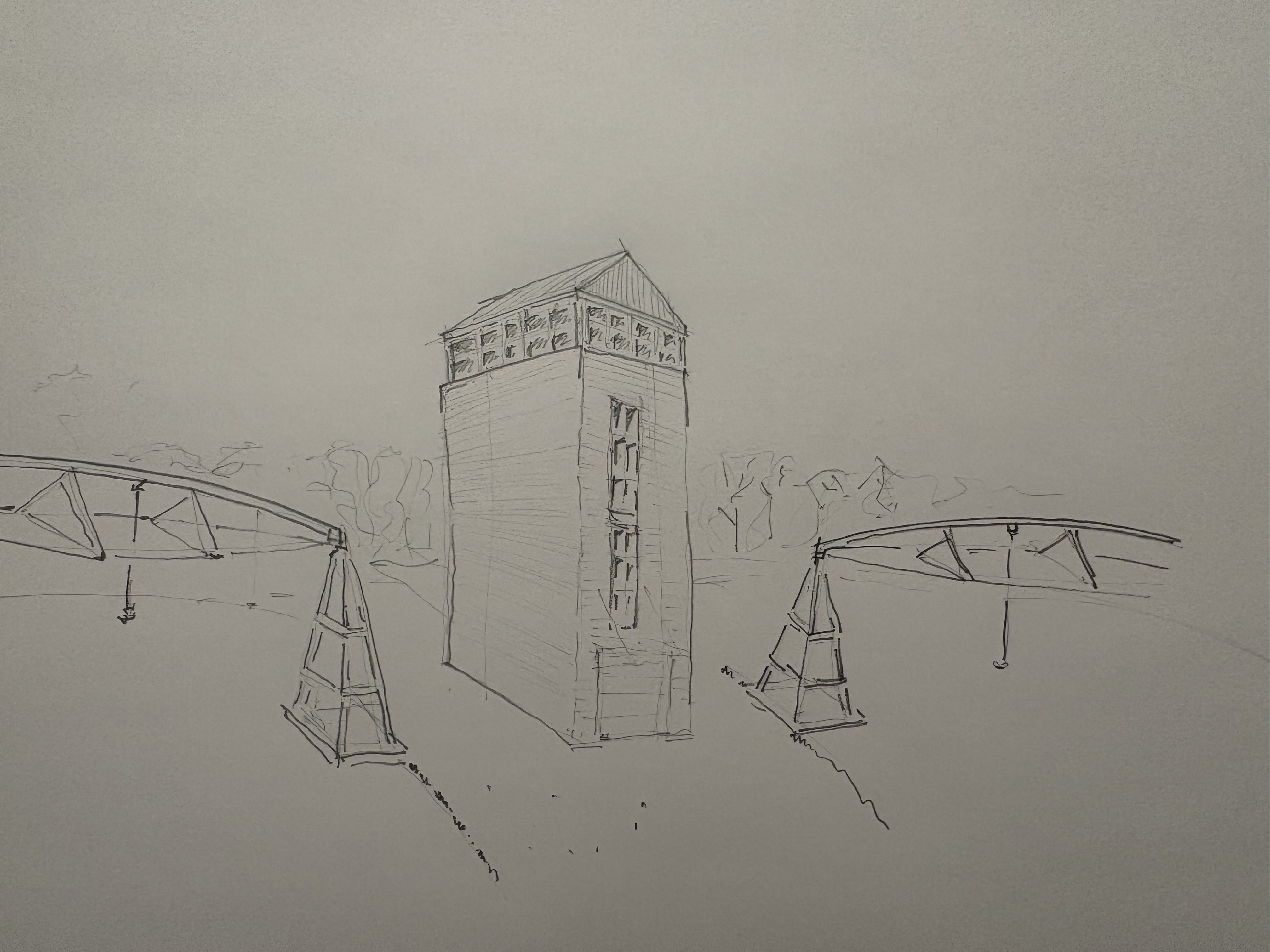 this is a old elevator that has been remodeled to be a tower house with the top floor being glass with the frames being rusted metal the roof it corrugated ventage silver there is an irrigation pivot on both sides