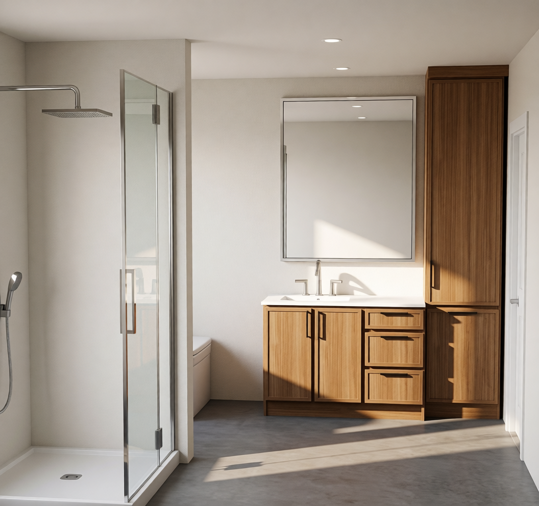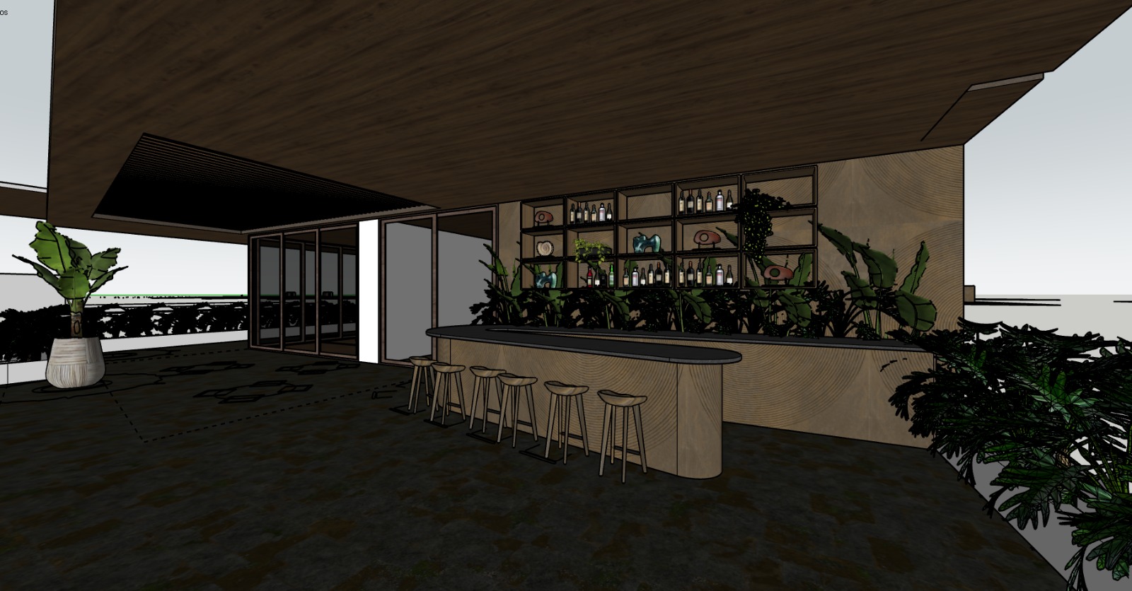 modern open air bar with a luxurious atmosphere warm wooden textures for the ceiling and bar counter soft amber lighting creating a cozy glow the shelves are lined with elegant glass bottles and vibrant decor furnish the bar with sleek light brown stools add lush green tropical plants for a natural touch the floor has a muted stone texture in earthy tones the setting exudes a tropical upscale lounge vibe blending nature and sophistication seamlessly