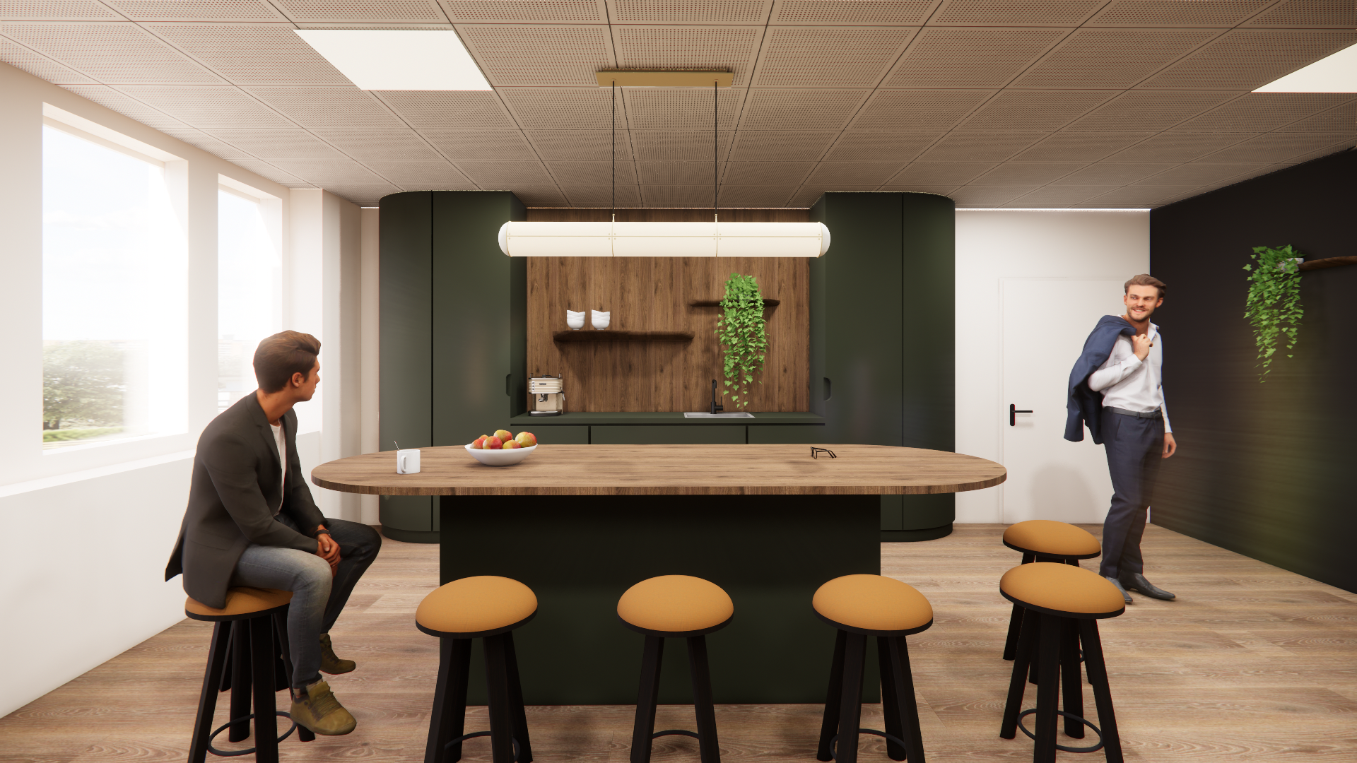 interior of a modern and rustic coffee corner with a serene and sophisticated ambiance by orange cushioned chairs t a large window lets in natural light creating a bright and airy atmosphere with a view of the cityscape the wooden floor is a dark natural brown enhancing the cozy feel diffuses warm light the atmosphere is calm professional and inviting