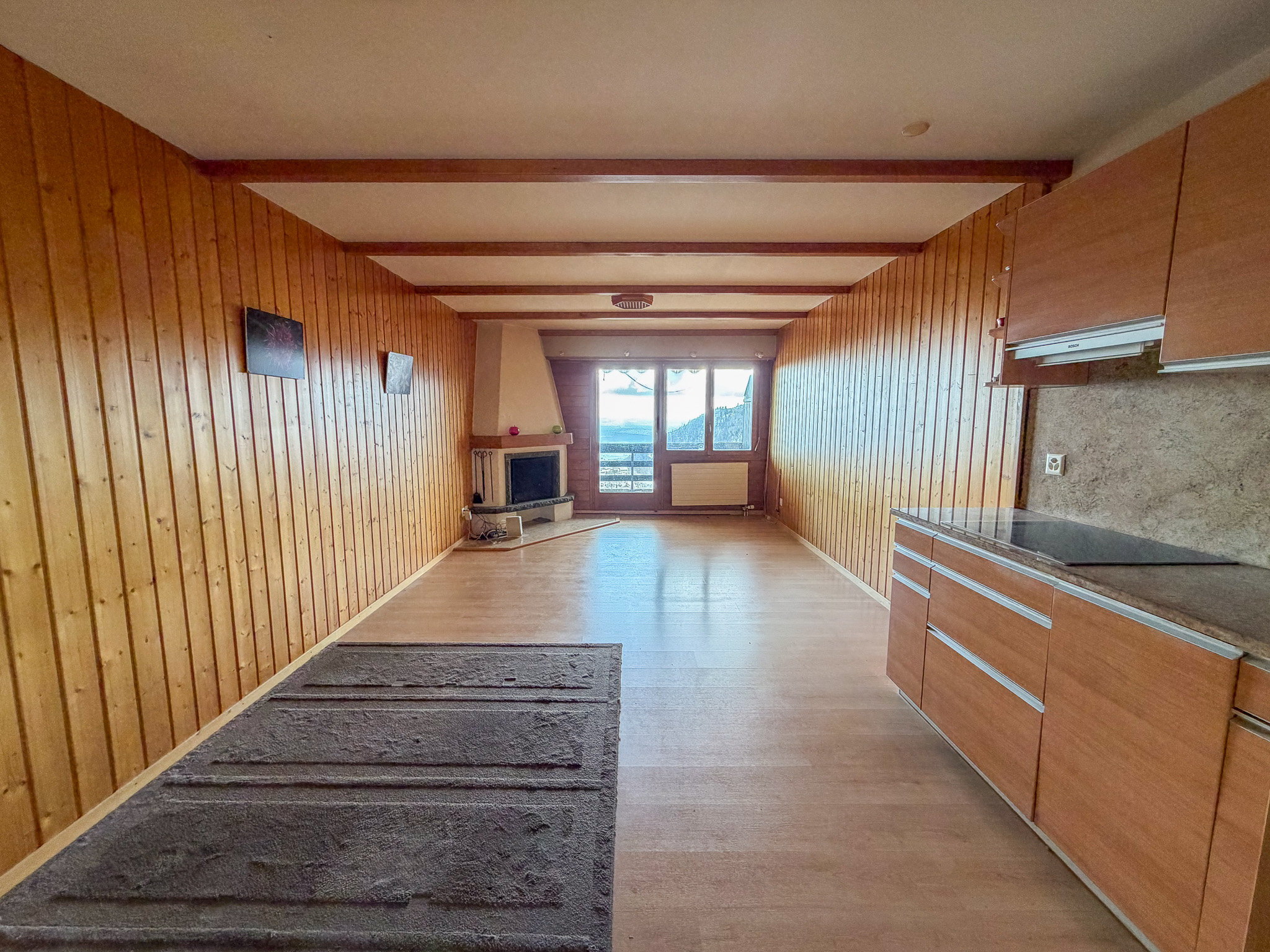 keep the room as it is just add a small plant on the edge of the stove a large plant in the bottom left corner of the image and in the back of the room near the fireplace a beige brown sofa in the middle left of the image and a table with four wooden chairs in front of the sofa