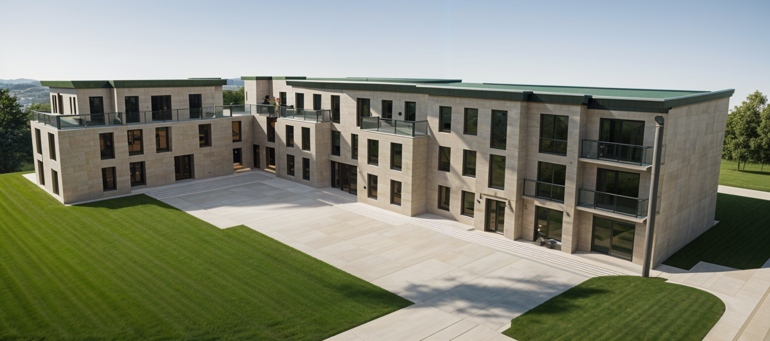 classical exterior shot stoneware facade other building in the background and something interesting in front of building like flowers grass and bushes gardens architecture