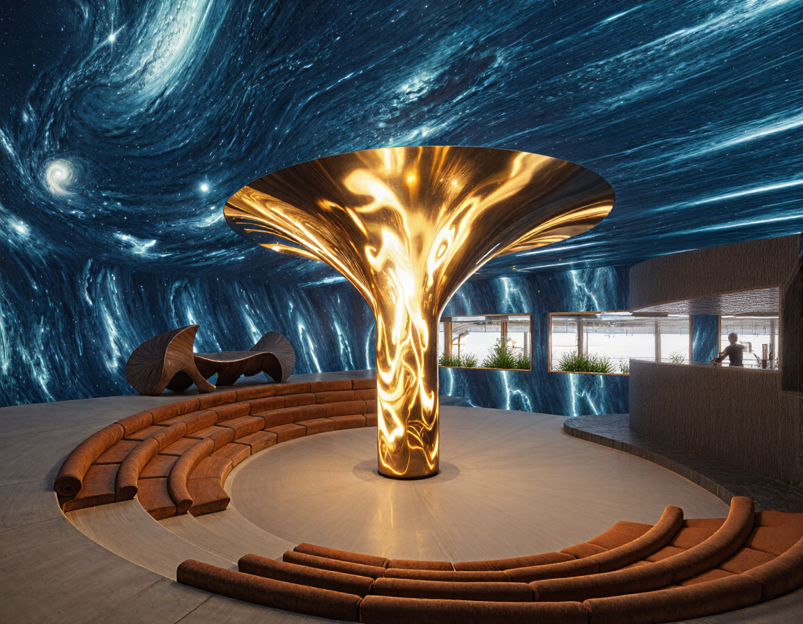 hyperrealistic projections of starry night milky way light beige cement floor dark red terracotta colored plush couch seating curved copper dj booth on left curved yqkisugi black wood design bar on right central column is led screen with bonfire design architectural photography style 24mm lens professional interior photography ultra realistic lighting natural imperfections high dynamic range physically accurate materials depth and atmospheric realism