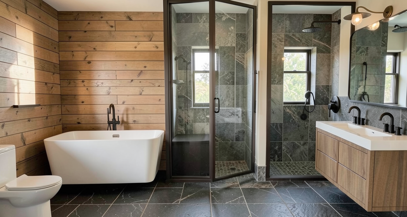 horizontal wood shiplap black stone floor tile shower