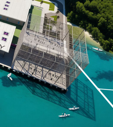 a la derecha sobre el mar hay una marina para barcos de vela y lanchas