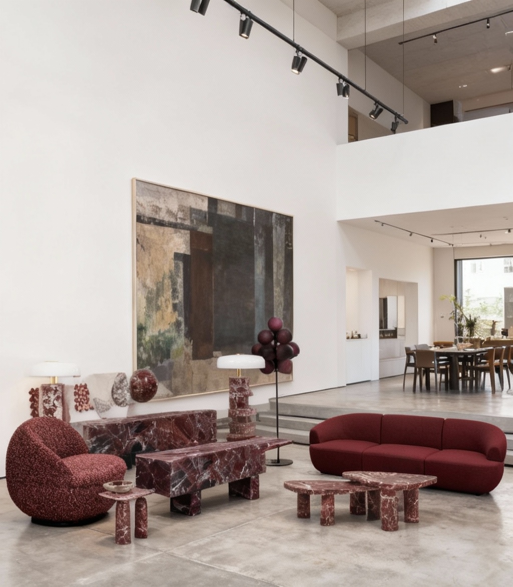 render in showroom concrete floor white walls large scale artwork track light put the side tables beside the sofa