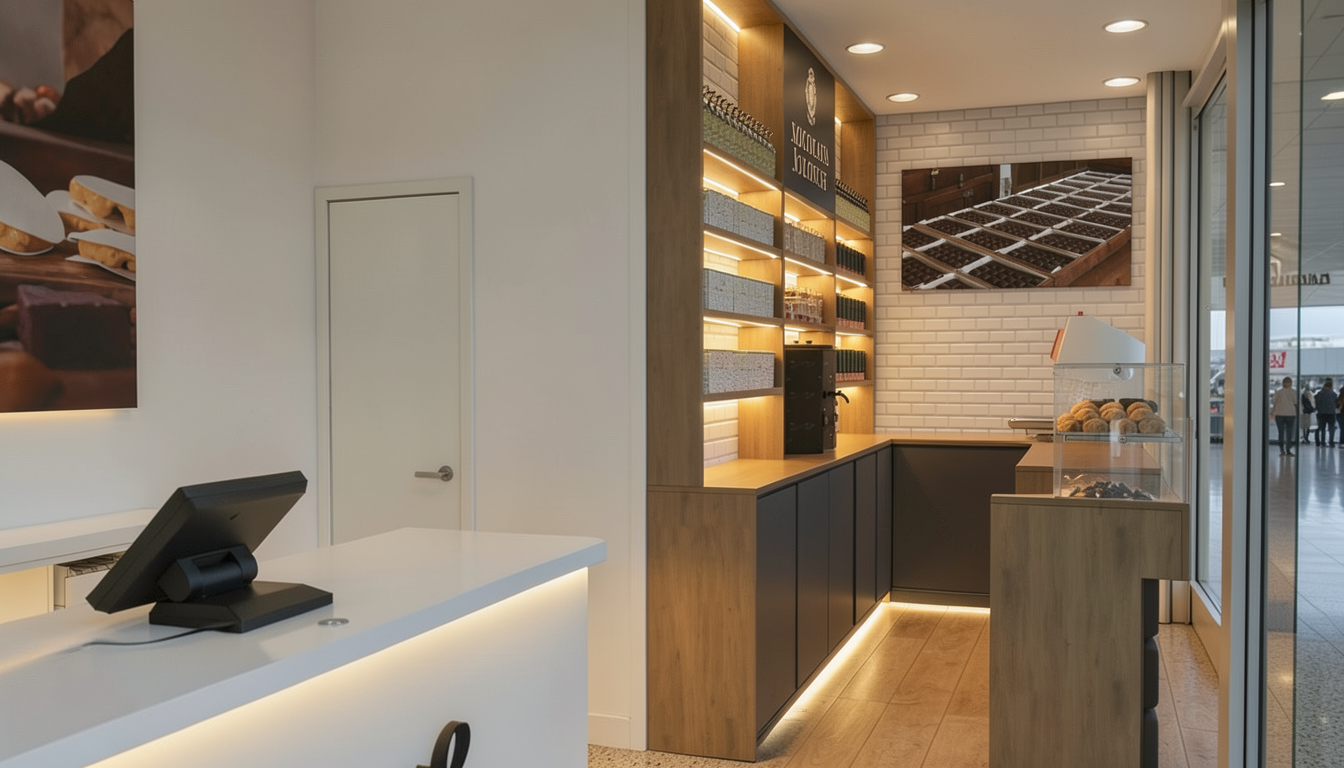 a food and beverage kiosk in an indoor pool moderm with palmtrees in the background