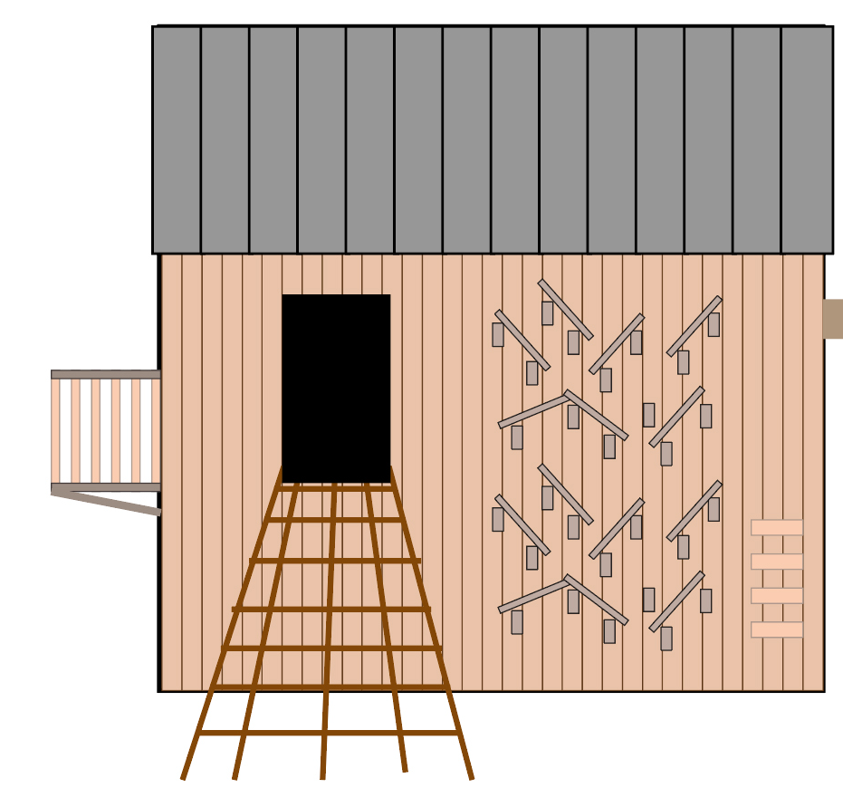keep the exact same design the roof is a light grey metal the wood is a smooth cedar finish the lines going into the door are rope netting only and deisgn is scandinavian inspired render to match design ground is completely in grass