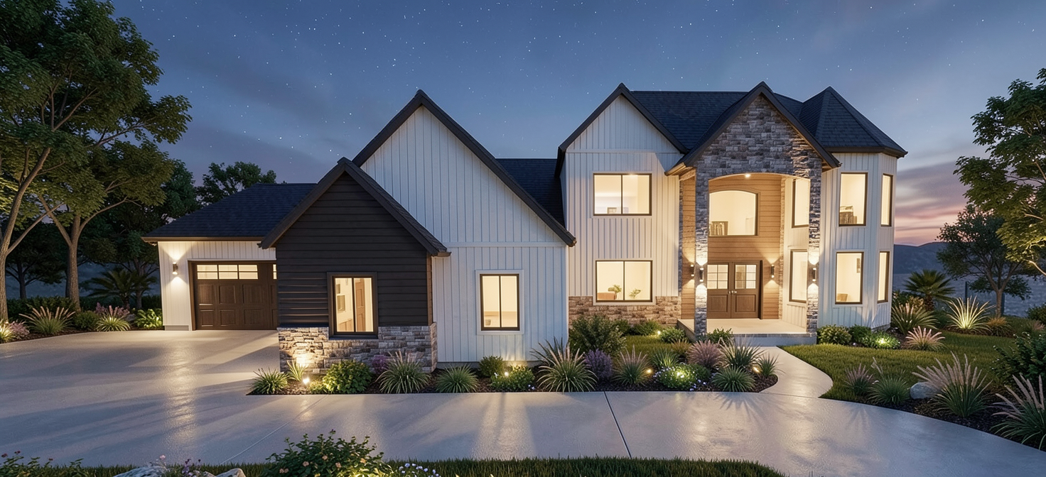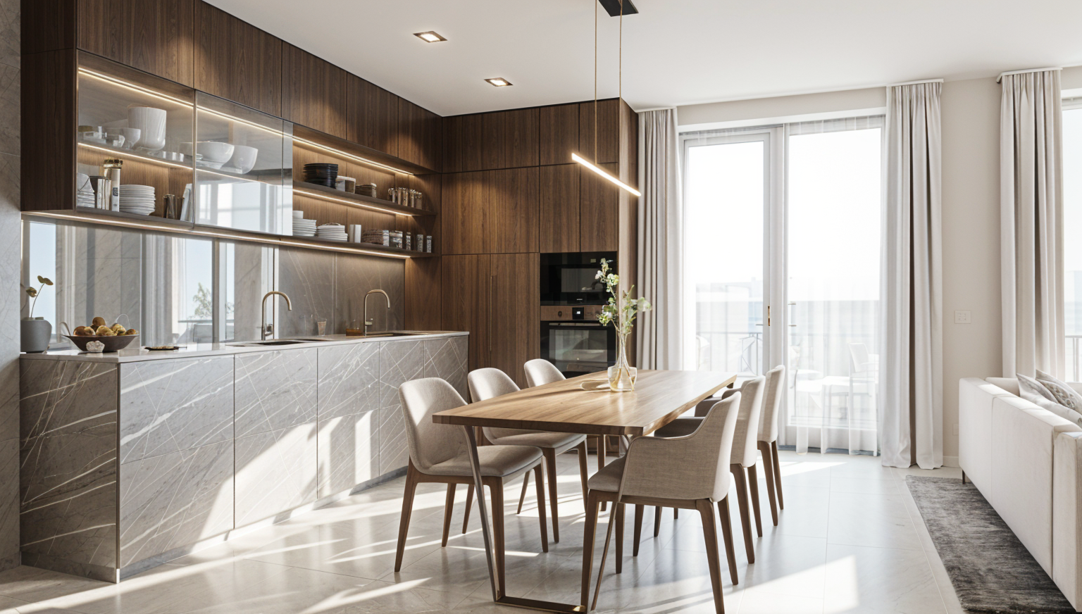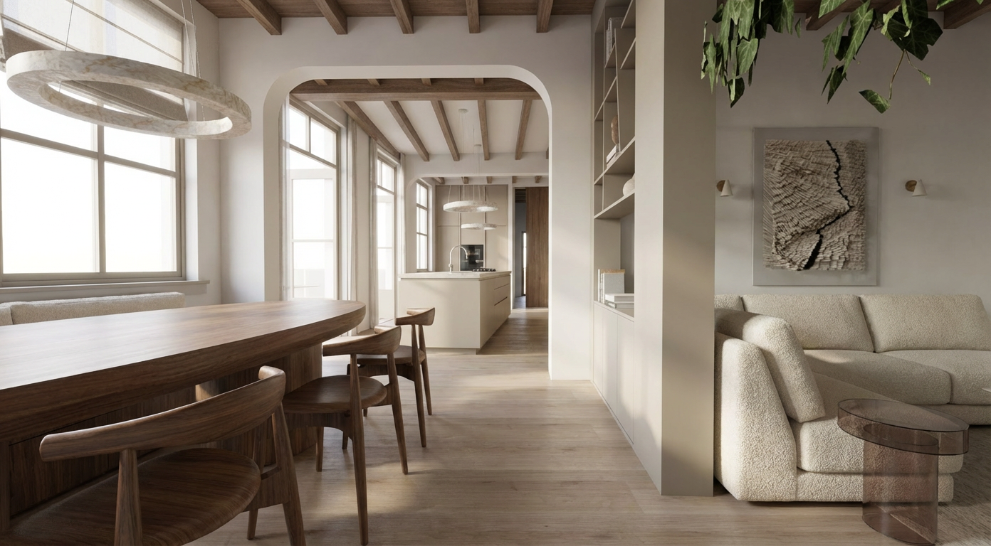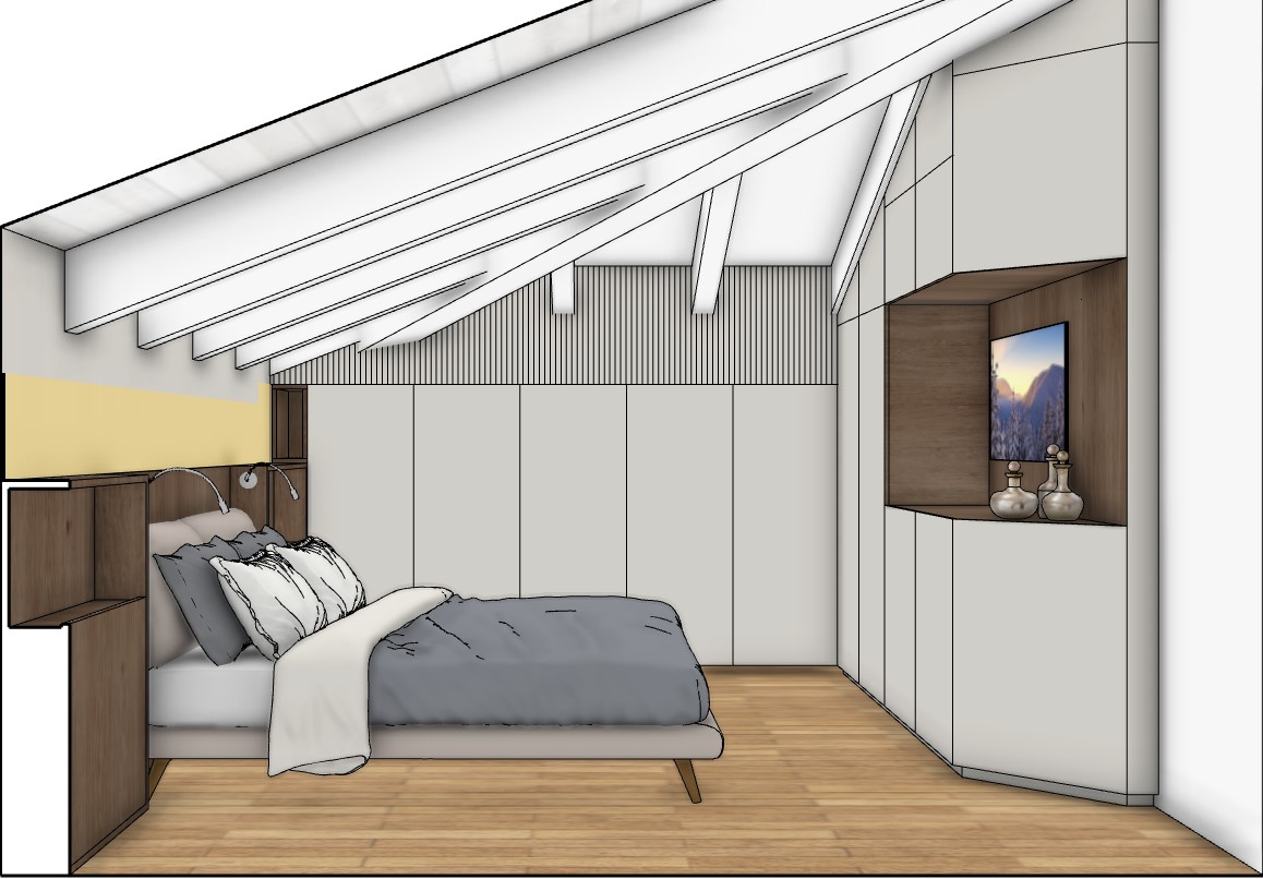 scene setup style an ultra realistic high definition photorealistic 3d interior render of a modern attic bedroom with a sloped ceiling featuring exposed beams viewed from a slightly elevated eye level angle the rendering style should be professional clean and architectural emphasizing photorealistic textures lighting and material properties the color scheme is sophisticated combining warm wood tones with off white and gray accents ceiling lighting the main feature is a sloped paneled wood ceiling with thick white painted wooden rafters below the rafters the ceiling panels are made of natural light colored wood crucially above the bed s headboard on the left an integrated linear led light strip is embedded casting a warm soft glow that provides ambient lighting to the sleeping area left wall bed area the left side features a custom built rich walnut wood headboard unit that wraps around the corner including open shelves the headboard area is illuminated by the integrated warm led strip and also features two slender flexible chrome finished reading lamps the bedding includes stacked gray and white pillows and a thick gray comforter rear wall wardrobes the rear wall is dominated by a wall of floor to ceiling built in white lacquer wardrobes with minimalist push to open doors ral 1013 the topmost section of these wardrobes features a segment of slatted wall paneling made of vertical wooden slats identical in color and finish to the white cabinets ral 1013 providing a uniform seamless look right side niche the right side features an angled white custom built cabinet unit within this unit there is a large open display niche with a deep walnut wood finish lining the interior the niche is elegantly curated with a large wall mounted flat screen tv displaying a mountain landscape or tranquil art several white decorative books and notebooks and two metallic gold finished sculptural vases or objects arranged elegantly on the wooden shelf floor details the entire floor is covered in oak wood planks with a natural grain rendered with realistic reflections all wood finishes headboard niche bed frame ceiling rafter wood should be cohesive walnut and light oak textures atmosphere focus the atmosphere is tranquil cozy and luxurious the focus is on the textures the grain of the wood the softness of the linens the smoothness of the cabinetry and the clarity of the led light effect the image should have a sharp depth of field rendering all elements clearly