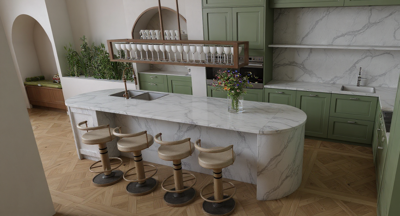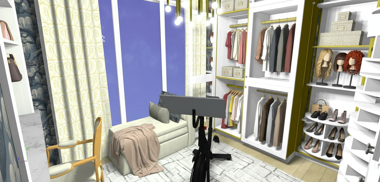 convert this floor plan into a realistic isometric 3d view of a full house show the space from an elevated angle with furniture walls and details visible horse stable with interior stall partitions with top half being open vertical bars the exterior walls to be board and batten e with 4 square windows in each stall along the exterior use the same furniture as shows on the plan do not change the orientation of the floorplan