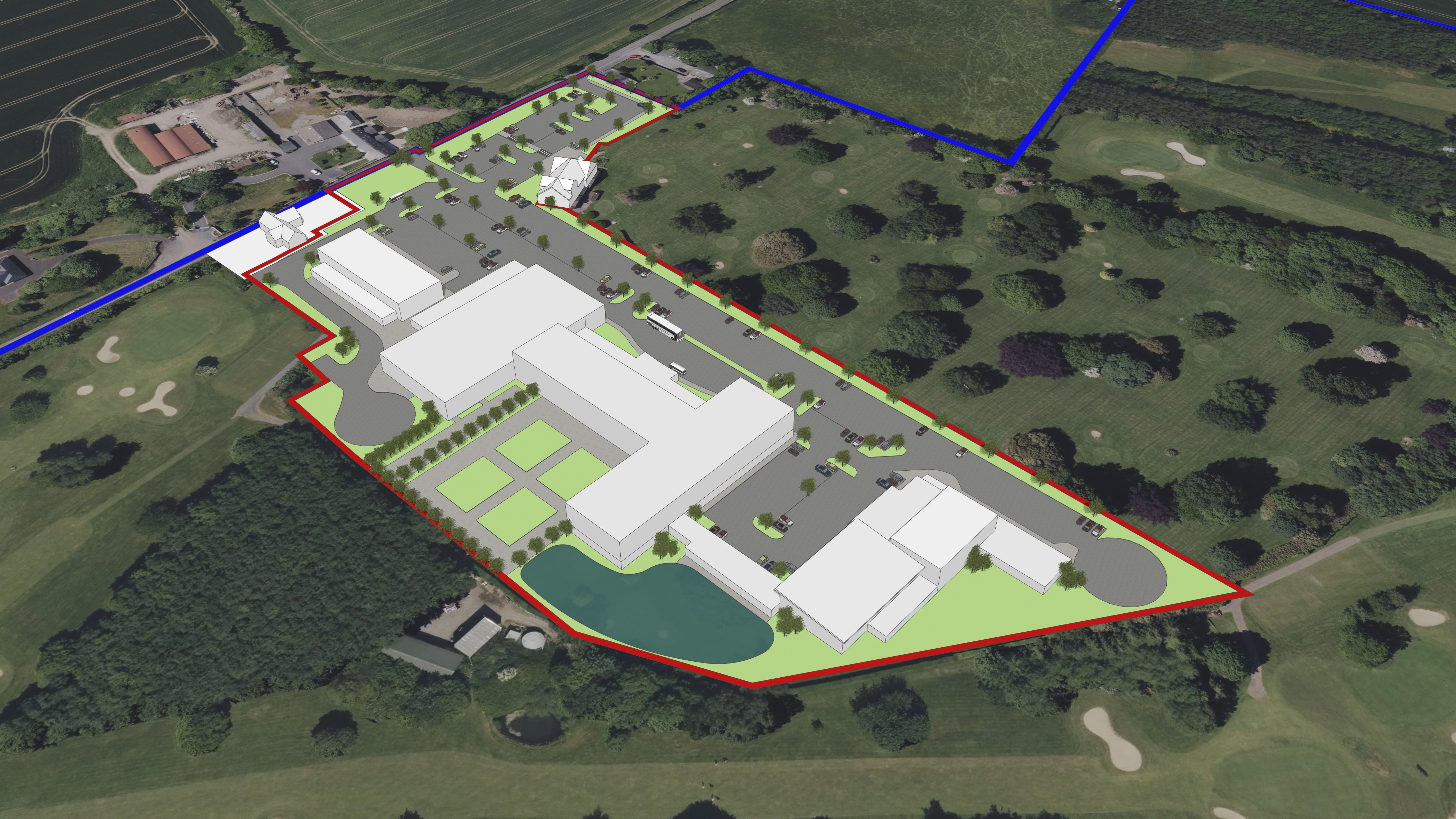 create a beautifully rendered aerial view of a modern hotel layout surrounded by lush golf course greenery use soft white and light gray tones for the buildings accented by dark gray for the parking and road areas surround the structures with vibrant green lawns and scattered trees in varying sizes and shades of deep green include a serene pond with teal blue water bordered by natural vegetation highlight pathways and boundaries with subtle hints of red and blue for definition the overall atmosphere should be serene and harmonious reflecting a balance between structured human design and natural landscapes ensure the lighting is warm and inviting suggesting a sunny day with clear skies