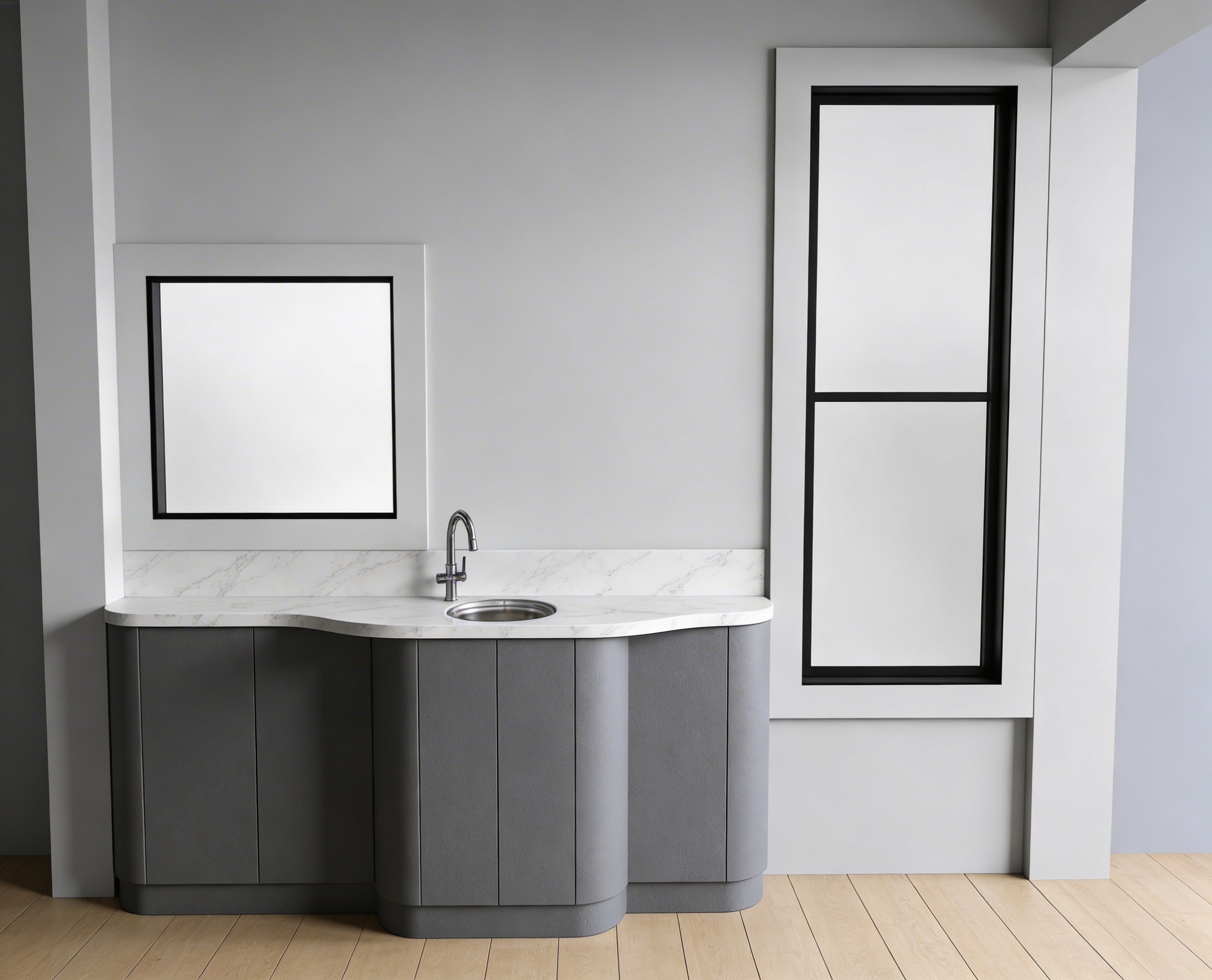 create a photorealistic render keeping the exact same geometry and angle of the current image the material of the building should be a light yellow natural brick with grey green metal details around windows and roof the building should be placed in a park environment in a scandinavian setting during summer