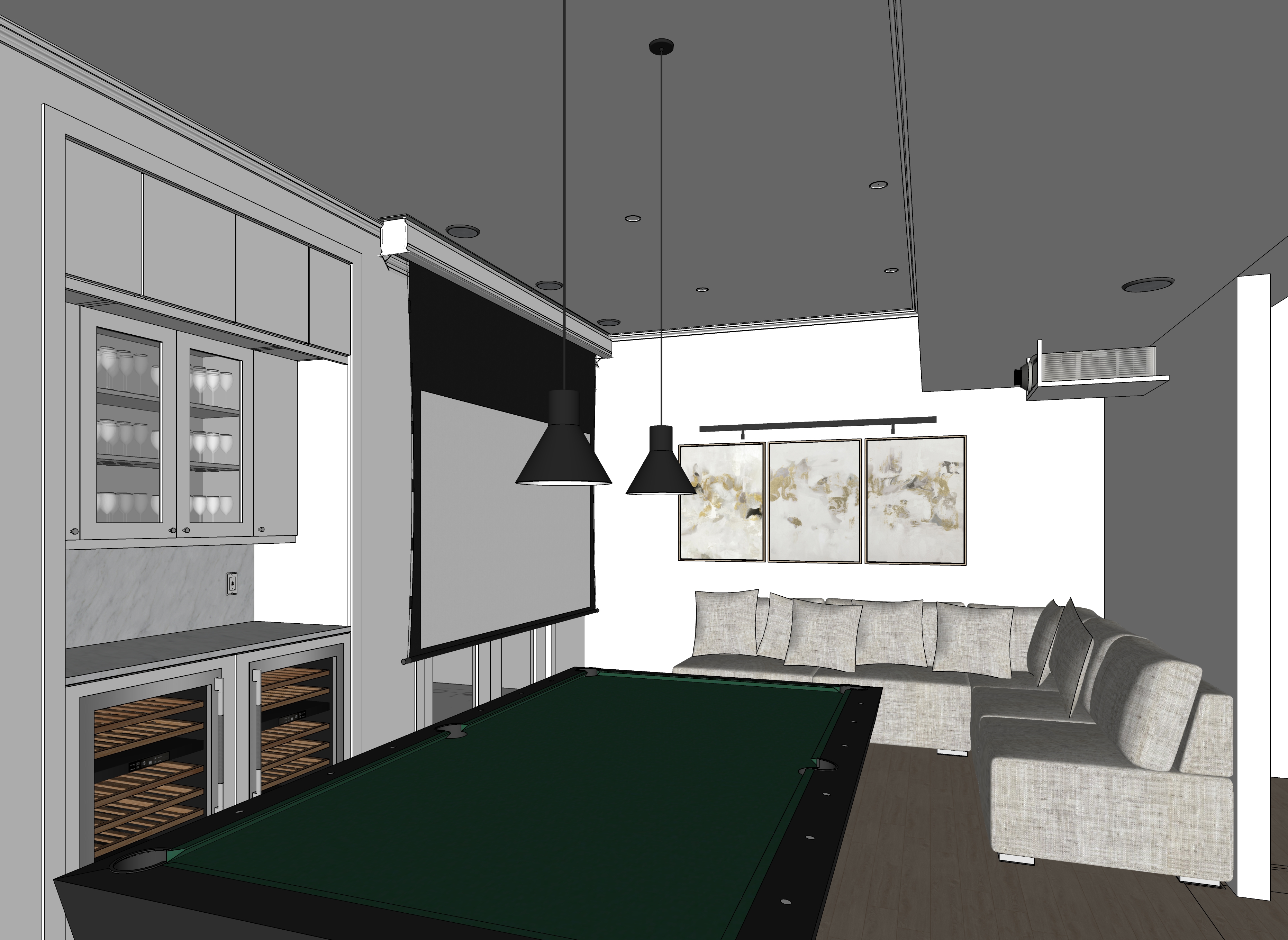 evening view and warm toned lighting make all of the walls and ceiling white cabinets are white counter top and backsplash are white marble show a kendrick lamar video on the screen on the left side of the view add a man playing pool with the balls randomly spread across the pool table add a woman watching the pool game add a cheese and cracker platter on the countertop and some wine bottles and glasses the three objects on the ceiling near the screen are speakers do not add any new elements in the space or on the ceiling the pool table felt is green the cabinets have slab doors make the light in the center cabinet with the wine glasses even from top to bottom of the cabinet and less bright add wine bottles inside the wine fridges