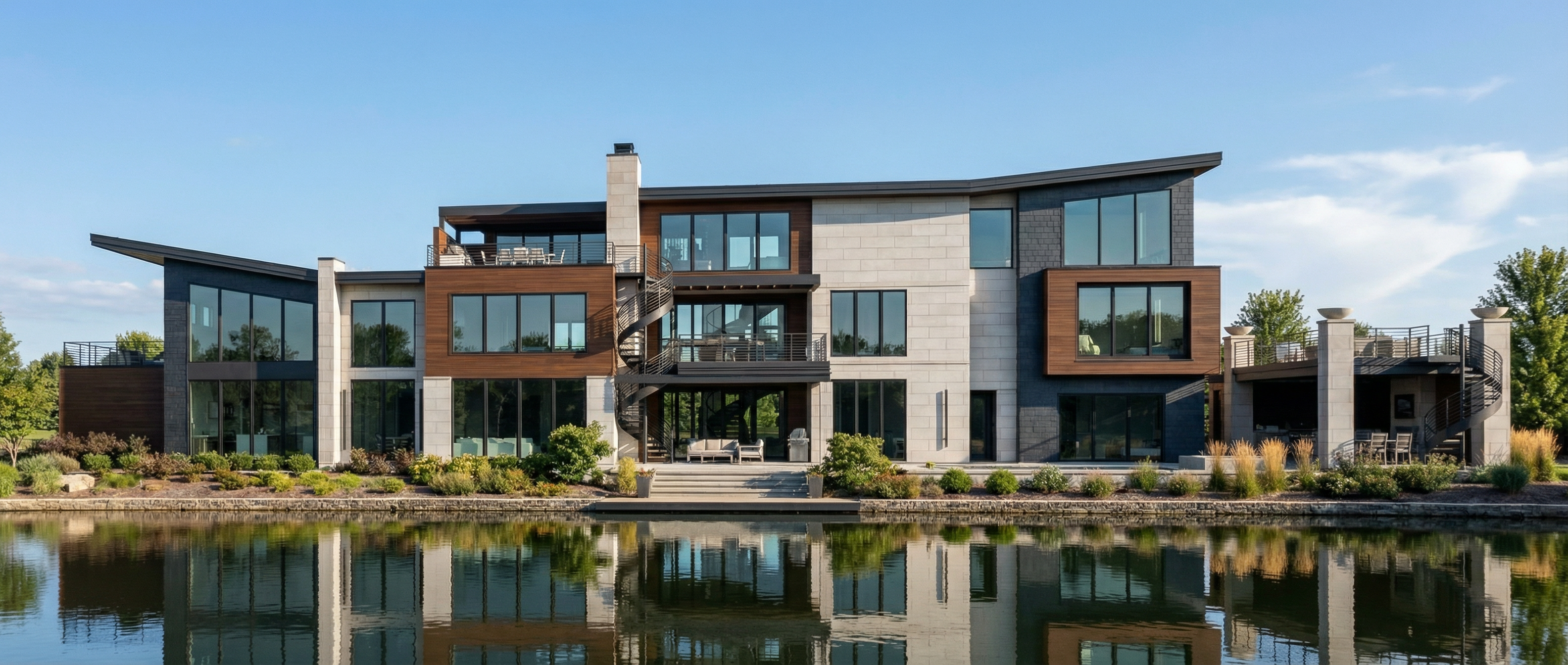 keep modern rectangular stone black slate siding on the dark grey areas of the house lake in forground with painted white metal sea wall