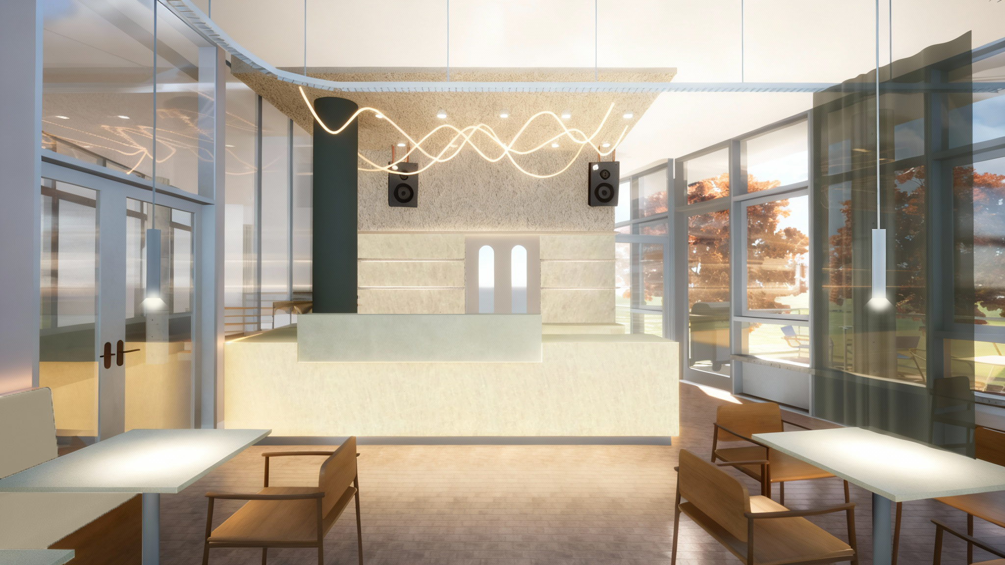 increase realism atmospheric slightly desaturated sharper image with more neutral but realistic evening lighting bar slightly glowing