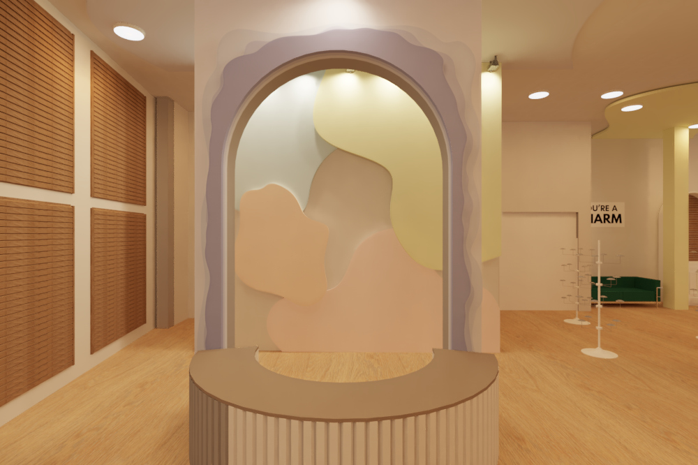 add natural lighting add simply charm name on wall with arch add handing handbags to slat wall on the left and hats on display racks on the right