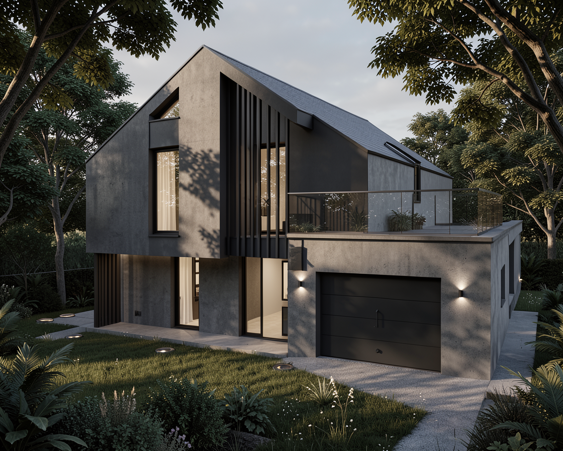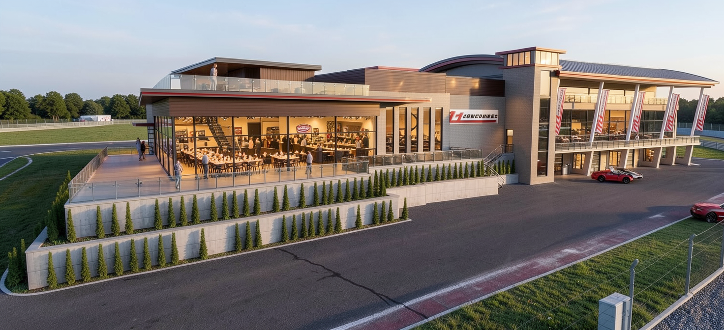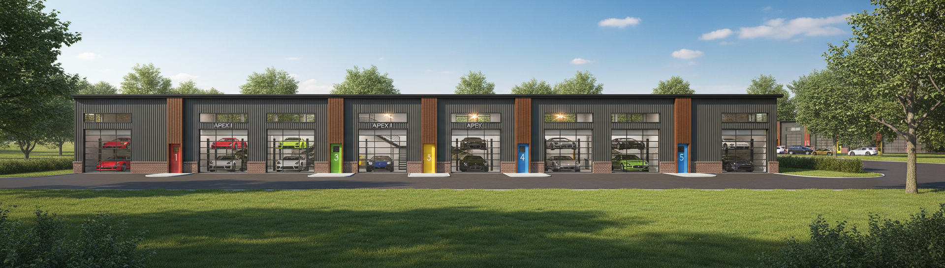 i am looking for a midwest rendering large lot if there is a similar modern sign the name of the development is apex 1 these are garage condo s the garage doors could be glass doors with luxury and vintage sports cars in the garage and parked outside the lighting in the garage led these units have a mezanine at the back of the unit that will be finished and liveable have the lighting in the garage led and in the back a steel staircase headed up to access the liveable portion have awarm light fixture on the second level in the back the front part filled with sports cars stacked on lifts each unit is a different width have some vertical decorative timbers separating the units each unit is owned by a separate owner so there needs to be walls dividing some of the spaces use the original upload and add access doors to each unit as an example the units have a 20 30 and 40 ft width to be available as a car condo make the entry doors to each unit a more modern door that is the same color and have consecutive numbers on them for each unit 5 total units with 1 2 3 4 and 5 going from left to right can you use the original design with differing widths per unit have apex 1 branding on the negative space per unit add more sports cars and a parking lot on one side with a driveway connecting the unit from a roadway with other similar units in the distance have it all be in line no corner units follow the provided concept exactly size door garage door spaceing