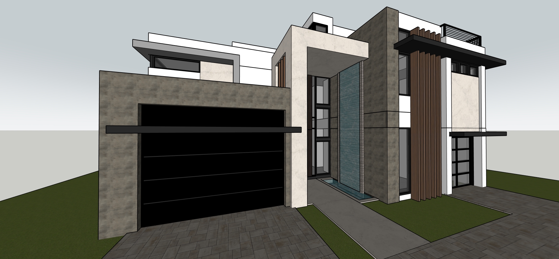 follow the geometry of the sketch exactly keep the camera view angle exactly ultra realistic 4k exterior of a luxury home at golden hour in south florida front view large widows with slim black frames main entry is cladded with a large modern natural stone tile and a rich wood color add soft accent lighting to make it look elegant and luxurious the garage on the left side of the image has a black modern door the garage on the right side has a glass garage door follow the driveway geometry exactly and make it modern concrete around the driveway in front of the house in green areas add minimalist tropical landscape typical of a south florida luxury house foreground landscape is tall palm trees short lavender shrubs in bloom and clean cut grass clusia privacy hedge on both sides of the house all in soft warm evening light under a clear blue sky hyper realistic architectural photography 24mm lens