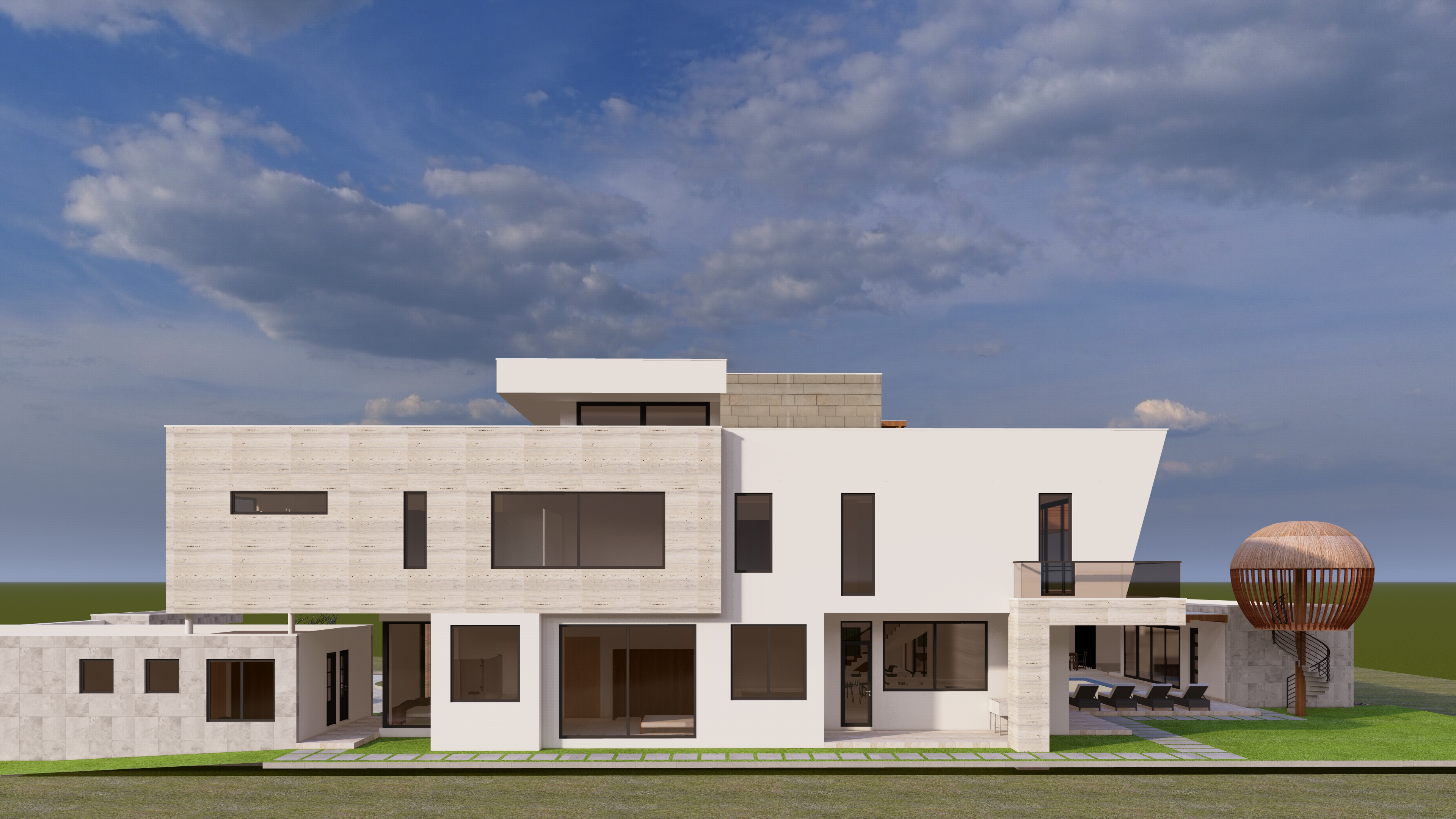 image of modern maisonette add few trees in far far background for context add very few vegetation including very very few floral ones for context as well make scene look lived in there should not be any haziness or excess strength from the sun light or sun rays