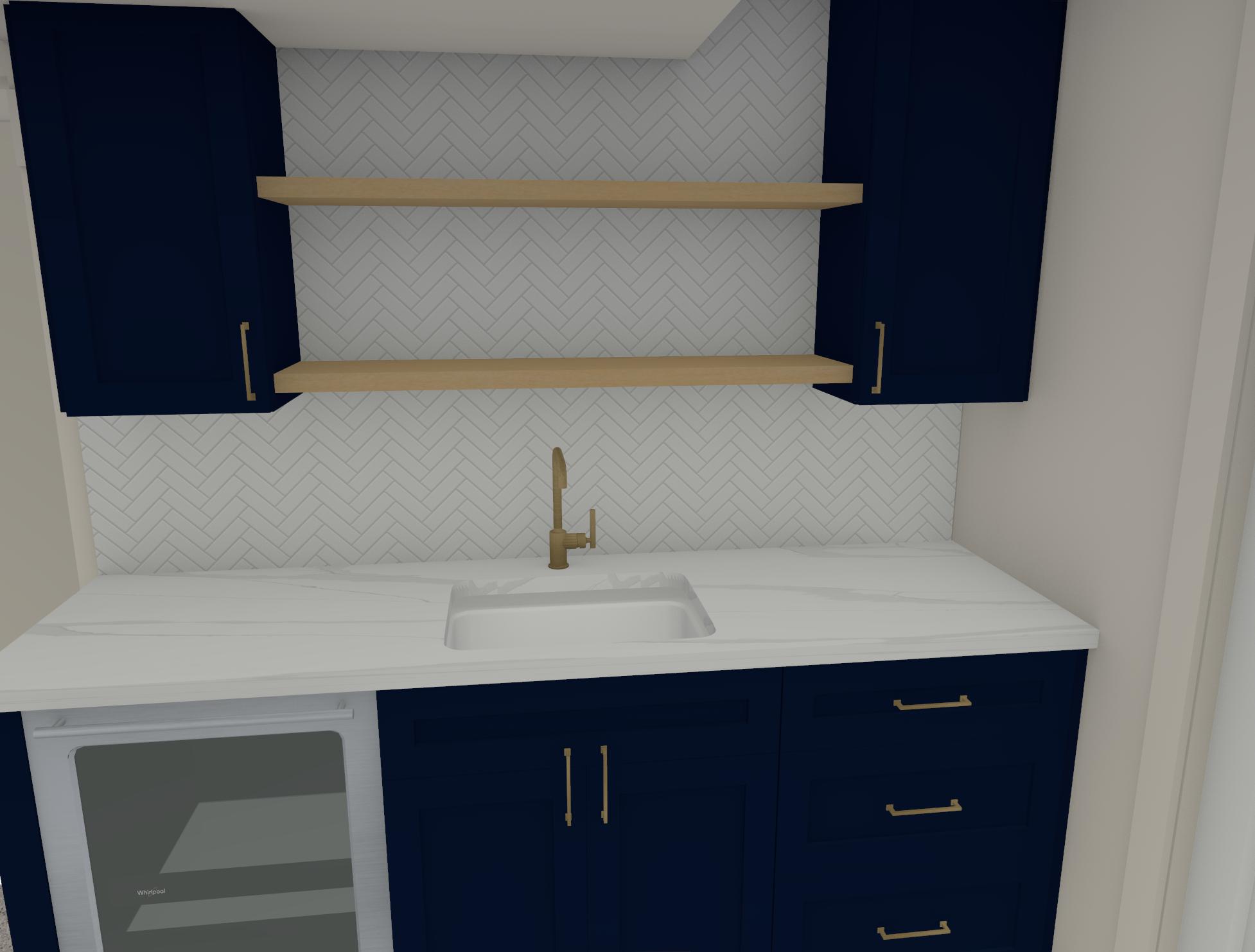 render no sunlight only artificial lights add bottles and food to the under counter refrigerator on the bottom left