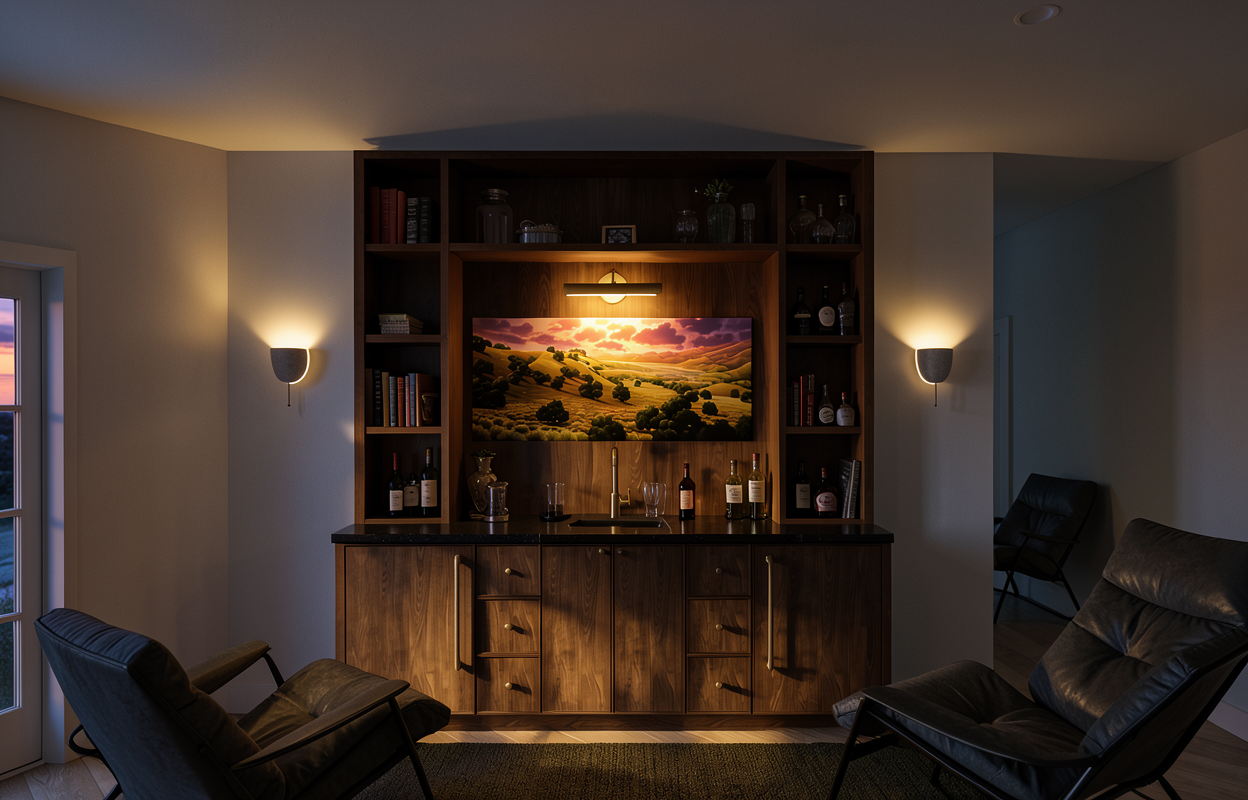 change the time of day to dusk keep the general direction of natural light add some moody modern dark lounge chairs far away from the cabinets so that the cabinets are visible the 2 chairs should be the same style and facing each other super close to the camera lens