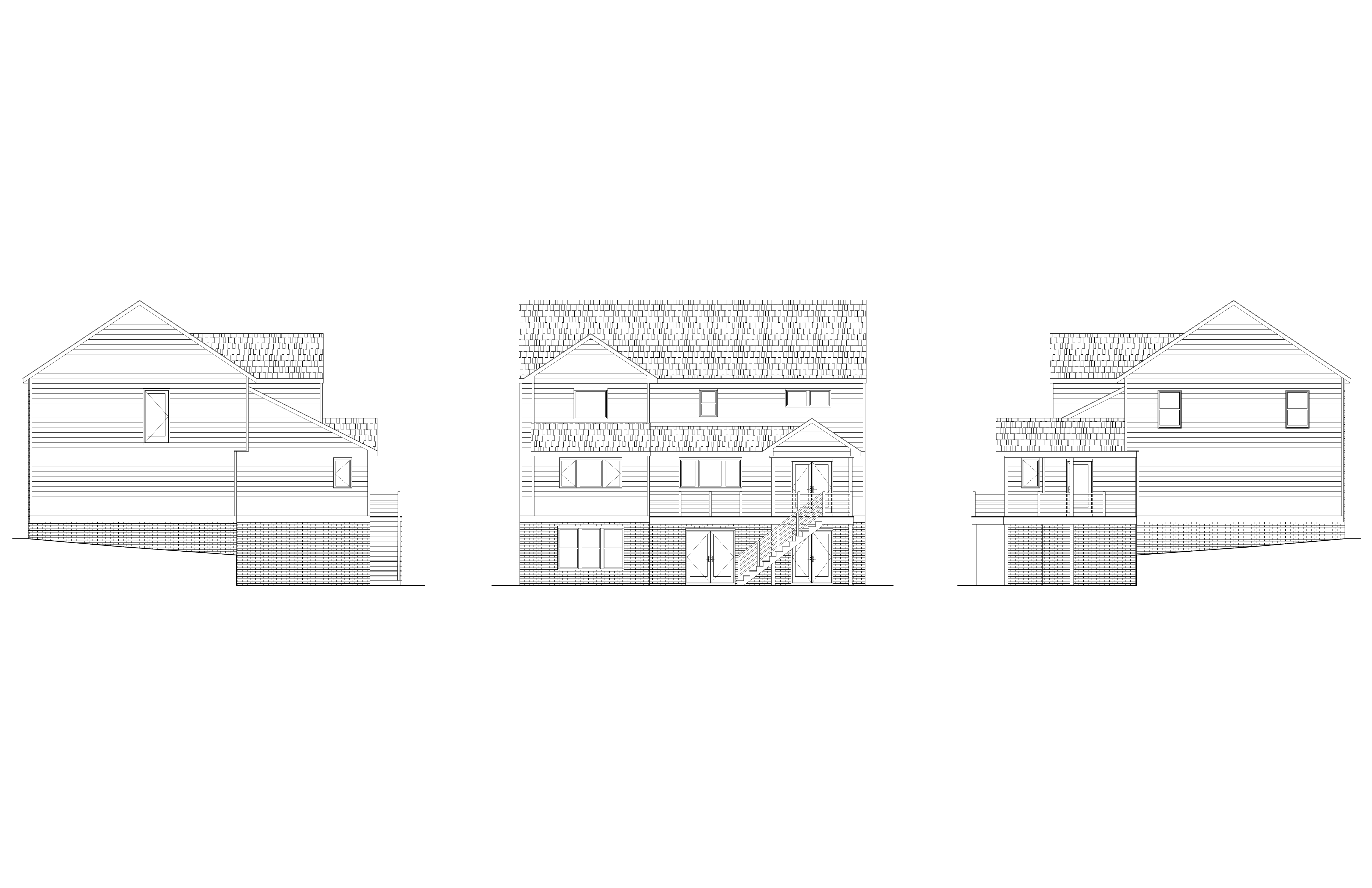 a beautiful modern house exterior view from three angles the house features light gray wooden siding and charcoal gray roof shingles large windows reflect the sky in a soft blue hue the stairs and balcony railings are a sleek metallic silver the base of the house is built with elegant white bricks surrounding the house is a lush garden with emerald green grass and colorful flowers the atmosphere is serene and inviting with a bright clear sky and soft sunlight casting gentle shadows