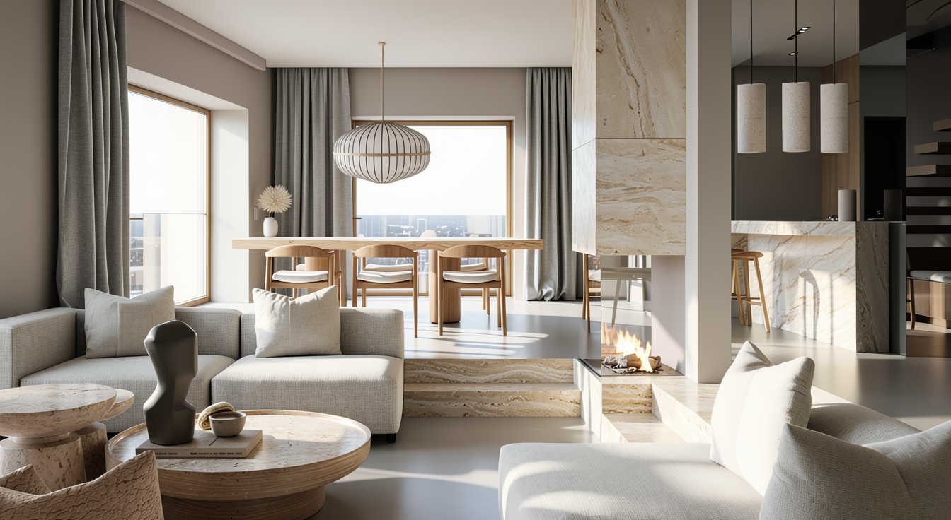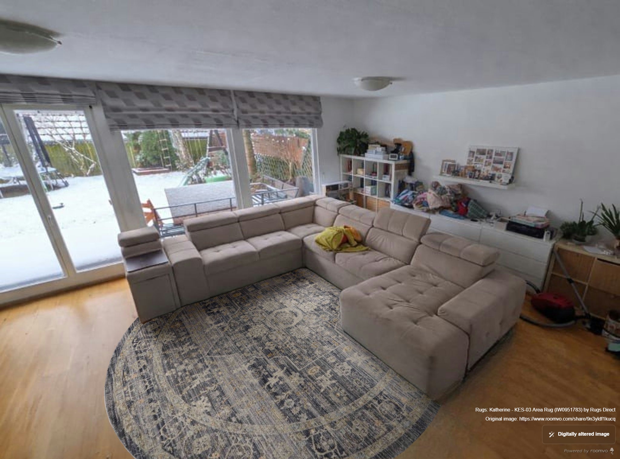 do not change the curtains and the couch the rug should be one colored and round i need a huge built in wardrobe behind the couch it sohuld have open shelves as well with backligt you can change the wall color te color of the parquette it should be dark walnut brown i want a classic modern style put pillows on the couch put in coffee table i want ceiling moulding 10 cm all round the room remove old lights i need a new ligting on the ceiling make the walls beige the ceiling should be beige make the window frame dark nut brown