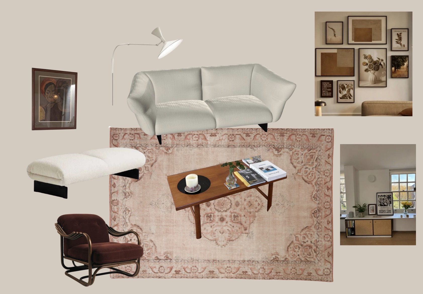 5m square room with eaved ceiling sash windows on left hand side with cabinets built in below gallery wall on wall ahead with bench below sofa on right hand side chair on left hand side by windows pink vintage rug with mid century coffee table parralel to sofa wall lamp on facing wall bride sofa