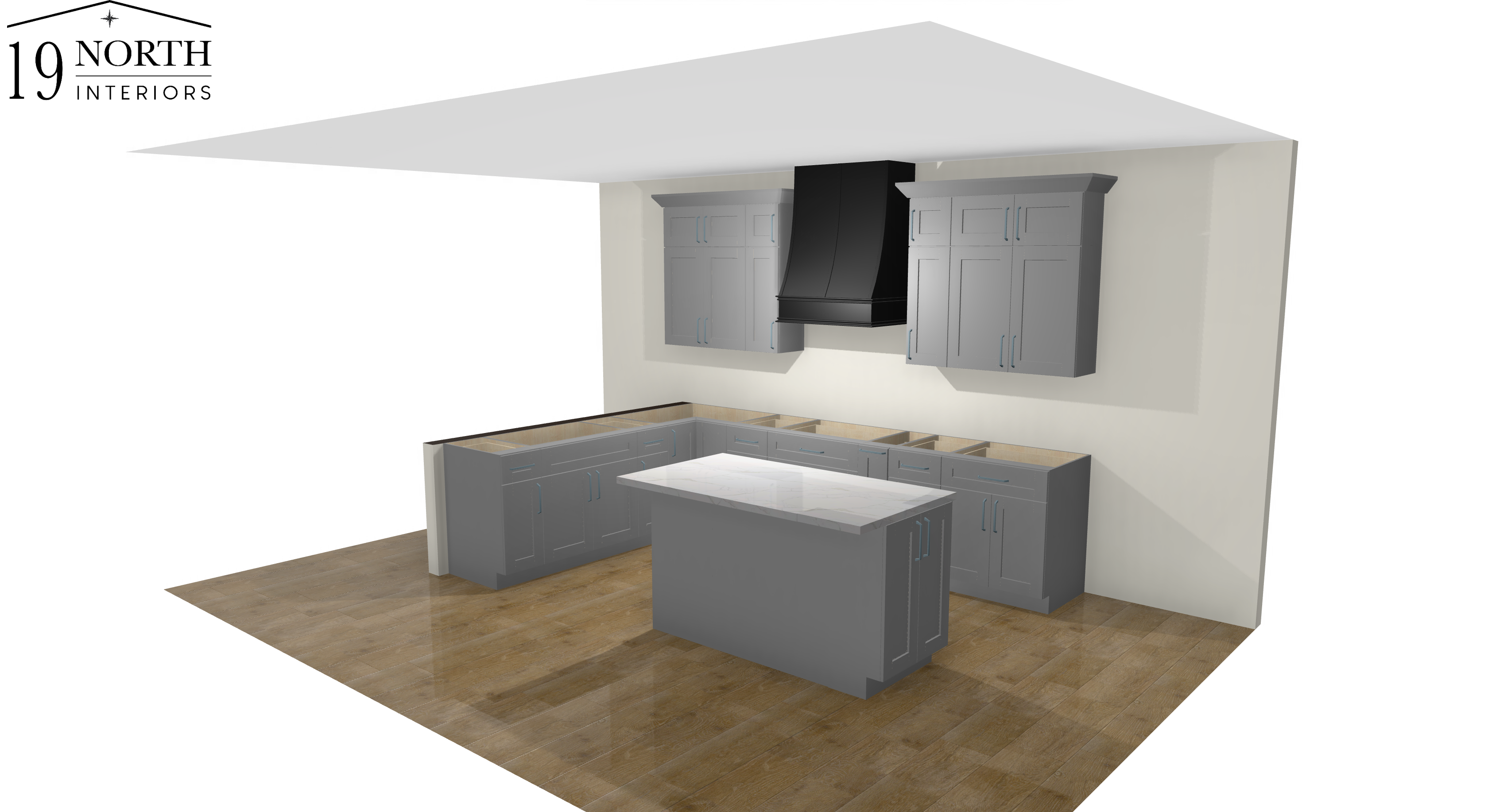 the gray cabinets should be white oak shaker cabinets the hood and island cabinets will be black make a photorealistic rendering