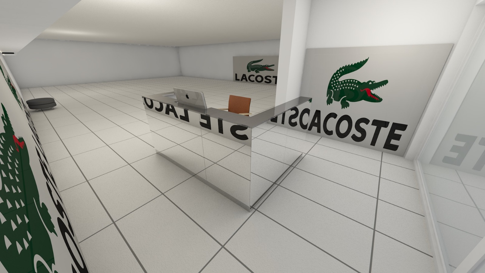 modern lacoste store interior with wall mounted mirrored cabinets and a sleek stainless neutral colors with green accents bright airy lighting with soft spotlights photorealistic
