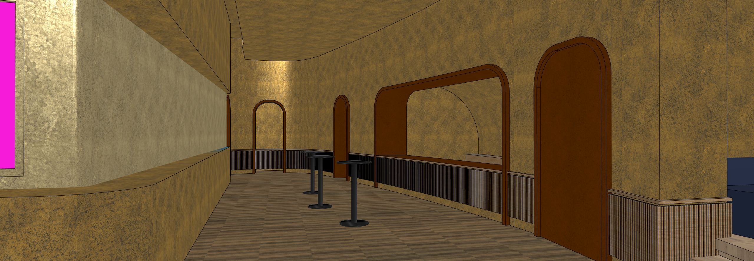 photorealistic render generated from the provided sketchup 3d image as a reference strictly respect the original geometry volumes proportions architecture and spatial layout visible in the source image the project represents a high end classy reception lounge located inside a football stadium the space must read as refined elegant and premium the render must preserve all existing wall floor and ceiling materials from the sketchup image special attention must be paid to the variety of textures material transitions and surface finishes each material must remain clearly identifiable and faithfully reproduced do not recolor materials do not replace materials with gold metallic or golden textures all original materials visible in the sketchup image must be strictly preserved the golden ambiance must remain subtle and atmospheric resulting only from warm artificial lighting interacting with the existing materials never from material changes strictly preserve the original material colors color tones coming from the sketchup image textures must be interpreted in a realistic high quality premium manner while keeping the exact original colors and material identities unchanged fully respect the color coding system present in the reference image there is no natural light in this render there is no sunlight no daylight no sky light and no light coming from outside the space the environment must read as a pure interior space with zero exterior illumination or exterior influence of any kind all lighting must be 100 artificial any openings windows or colored shapes visible in the reference image must not emit light must not glow and must not suggest any exterior brightness or exterior environment artificial lighting must be warm soft and indirect it should enhance volumes materials and architectural depth without overexposure the lighting must create a refined elegant high end lounge atmosphere the warm and golden feeling must come exclusively from artificial lighting color temperature and light reflections never from recoloring materials or introducing exterior light all furniture visible in the sketchup image must be kept exactly as is no furniture decorative objects lighting fixtures screens or architectural elements may be added removed or modified except where explicitly stated below color coded areas in the native image are strict functional placeholders and must be replaced exactly as follows with no alternative interpretation any green colored shape represents a television screen and must be replaced exclusively by a realistic tv displaying a football match of olympique de marseille om the content must clearly read as a live football broadcast match action stadium atmosphere broadcast framing any fuchsia colored shape represents a mirror and must be replaced exclusively by realistic mirrors with accurate reflections consistent only with the artificial interior lighting these mirrors must not emit light archsynth must take no artistic freedom beyond what is described in this prompt do not introduce implied elements decorative interpretations or stylistic alterations no people unless explicitly requested elsewhere the final render must be clean photorealistic elegant strictly controlled and clearly convey the atmosphere of a premium interior lounge lit exclusively by artificial lighting