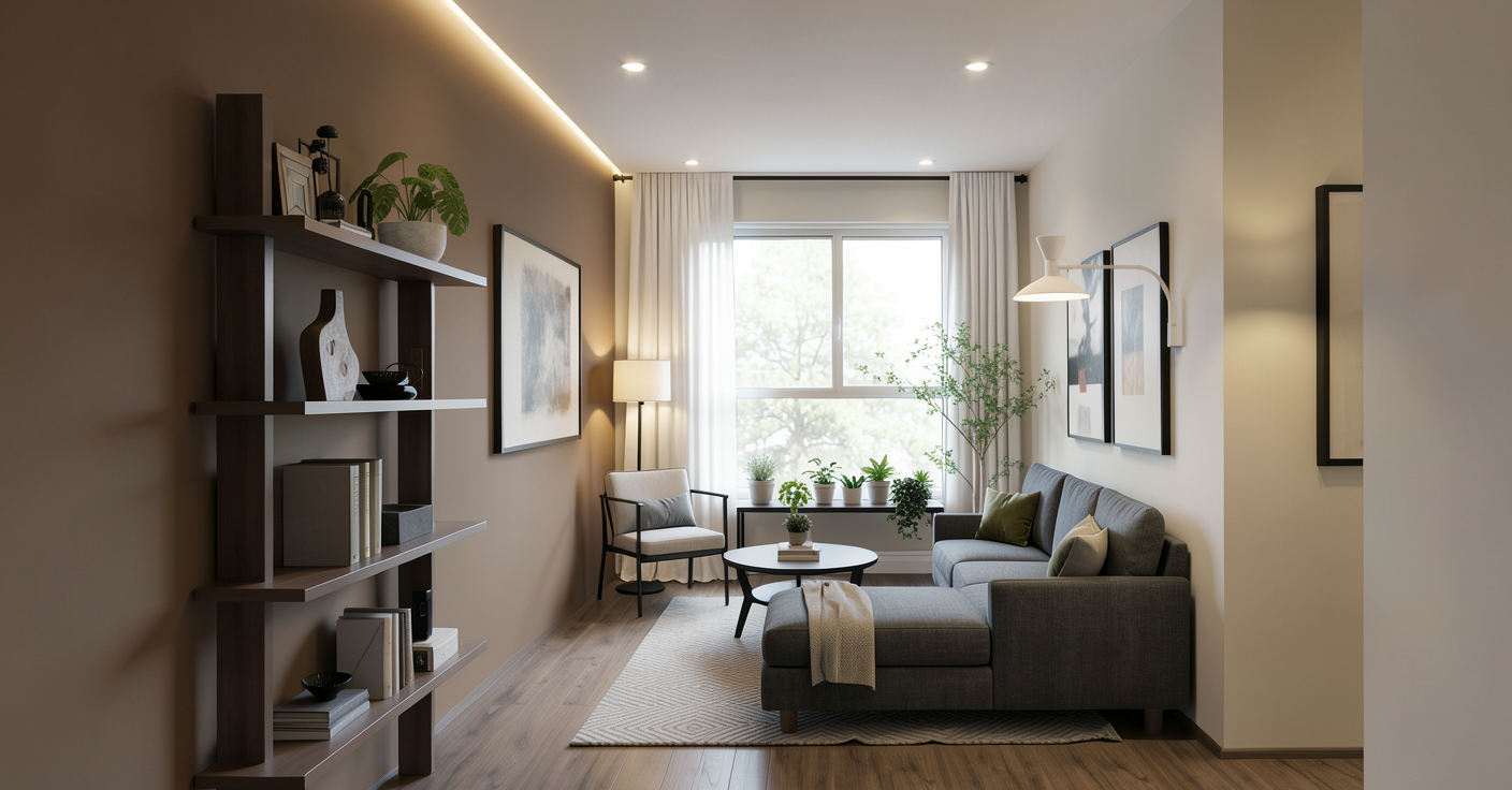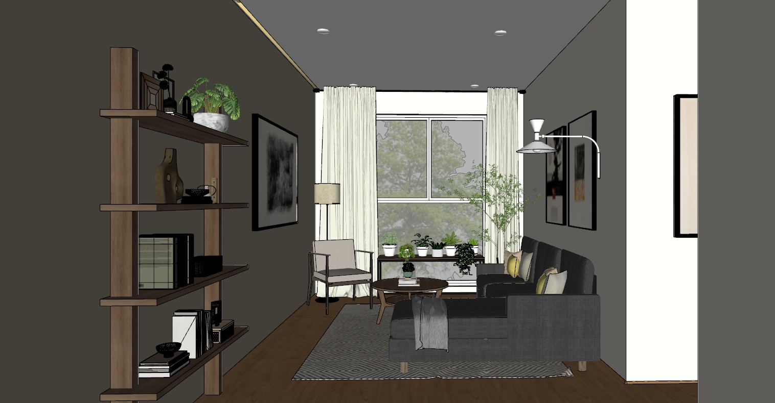 a large floor to ceiling window with white framing is centered at the back wall the window extends fully from the ceiling down to the floor with no solid wall section below the area behind the plant table is also transparent glass not a wall the outdoor scene with trees must be continuously visible through the entire height of the window including the lower section behind the table and plants sheer white linen curtains softly diffuse daylight but still allow clear visibility of the exterior greenery no wall base no opaque panel no obstruction behind the table the window must remain visually continuous from top to bottom with uninterrupted exterior view