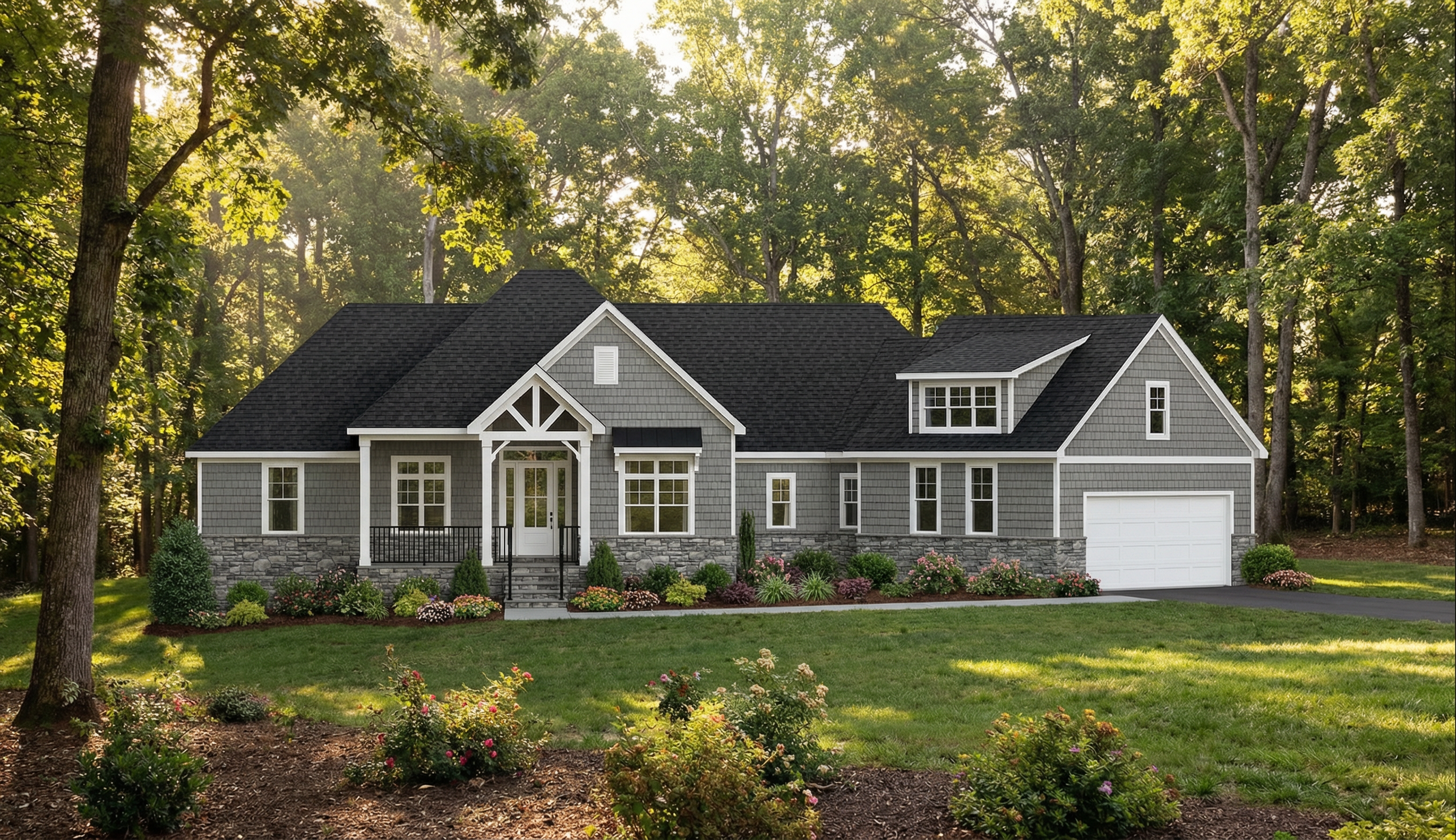 make as photorealistic as possible while keeping textures the same as selection professional landscaping in a lightly wooded scene with good lighting match materials to plan and remove any text medium grey shake medium grey stone blend white windows white trim black roof black metal railing on porch white porch post per plan the area above the front door is open to the house white garage door no windows no full front porch just the area around the door