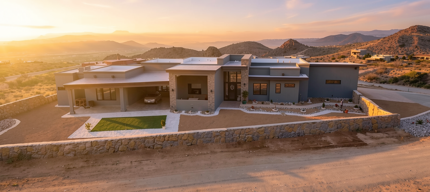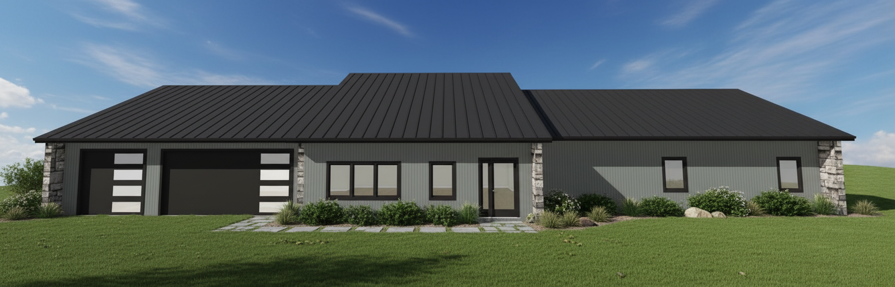 edit the image while preserving the architecture lighting composition and all other materials change the facade cladding to graphite gray slotted perforated metal panels with small horizontal slots with rounded edges and a modern matte finish change the main entrance frame portal to granite natural stone with a deep black and gray tone and a matte honed texture keep all other elements exactly the same including lighting curtain wall doors logo wall and overall proportions and architectural elements