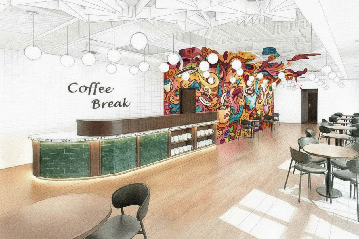 place a colorful mural on the wall near the back hallway adjacent to the two top tables